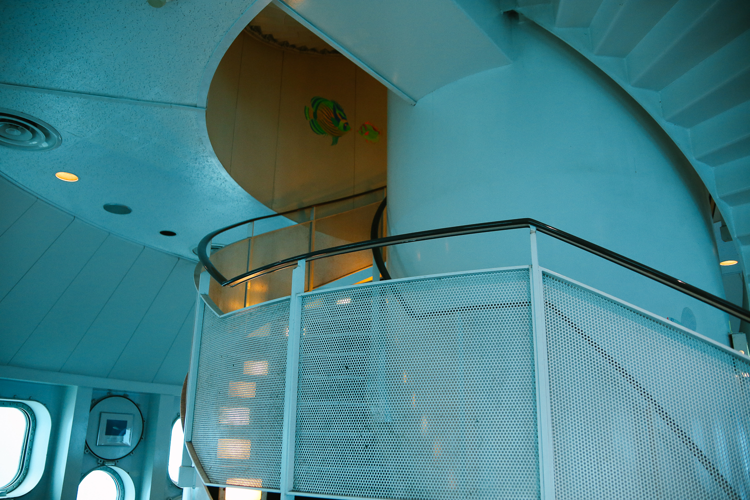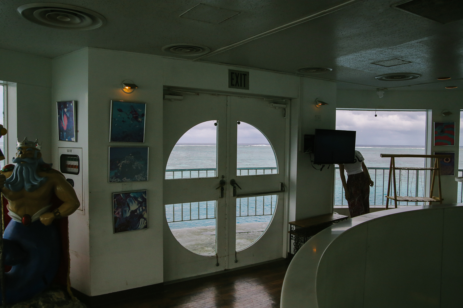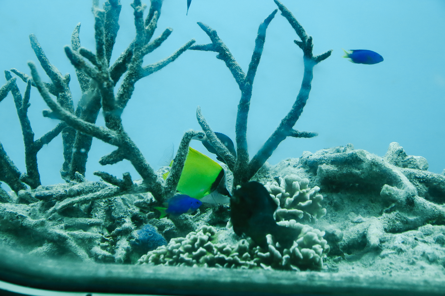 처음에는 너무나 새파래서 창문 정도의 크기 어항으로 연출한 건지 착각했었는데 알고보니 바닷가를 구경할 수 있는 창문이었다. 창문 배경이 생 파란색이라 오해를 했었다는^^;; 조금 흐리긴 하지만 창문 너머 멀리 해양 생태계를 감상할 수 있었다.