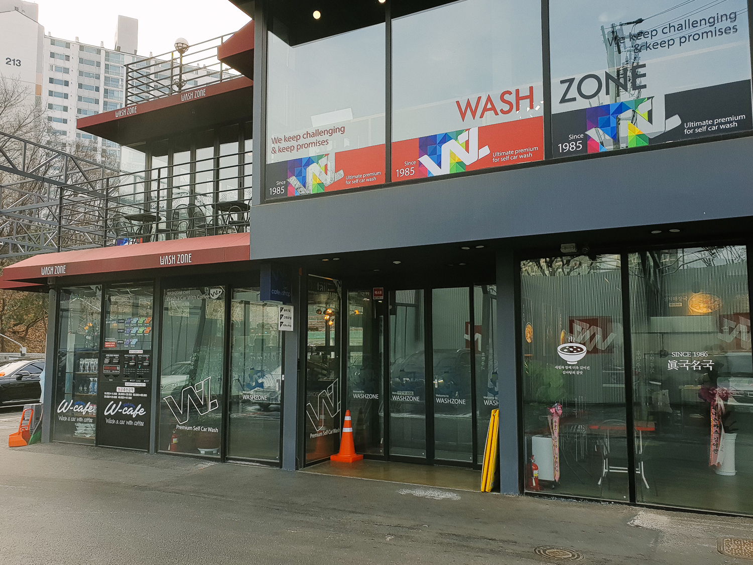 우측에 보이는 것이 워시존 건물, 세차를 하지 않는 사람은 저곳 카페에 들어가 커피를 마실 수 있다고 한다. 위 사진에서 출입구 쪽에 자판기 같은 게 보이는데, 이곳은 워시존 시스템은 다른 셀프세차장과는 조금 다른 점이 있다.