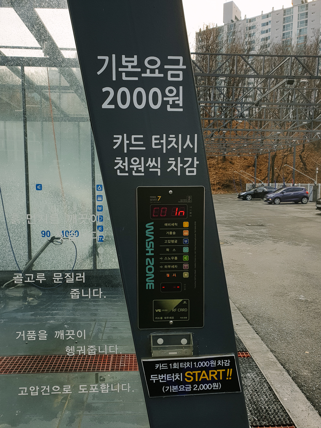 셀프 세차가 익숙치 않는 나로서는 조금 어리버리했다. 여기에서 예비 세척, 거품 솔, 고압 헹굼, 스노 폼, 하부 세차, 정지 버튼이 있는데 순차적으로 진행해야 하는지 알고 너무 정직하게 눌렀었다^^;;; 그리고 카드 터치하는 곳에 한번 터치 시 1,000원씩 빠져나가는데 한 옵션마다 2,000원 금액이니 두 번씩 터치하여 2,000원 결재 후 사용하면 된다.