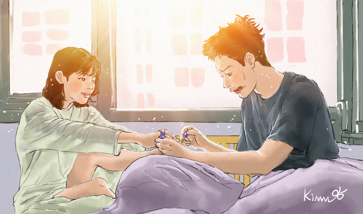 잠이 채 가시지도 않는 그는 까치 머리를 하고 그녀에게 네일을 해준다.