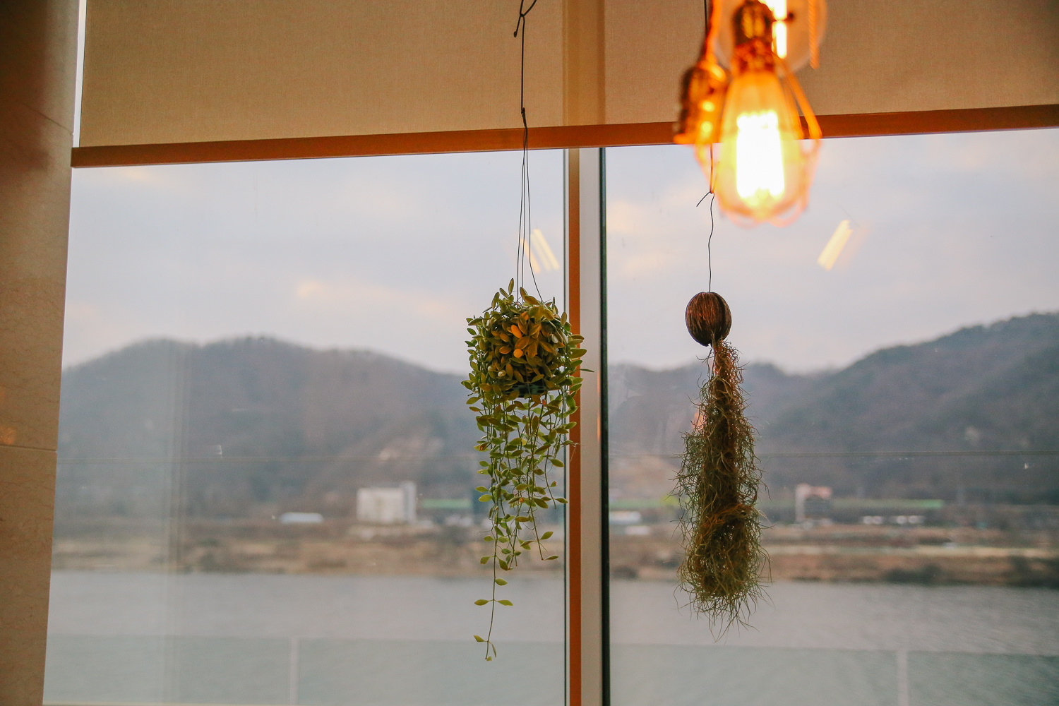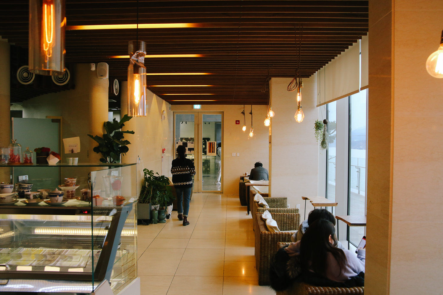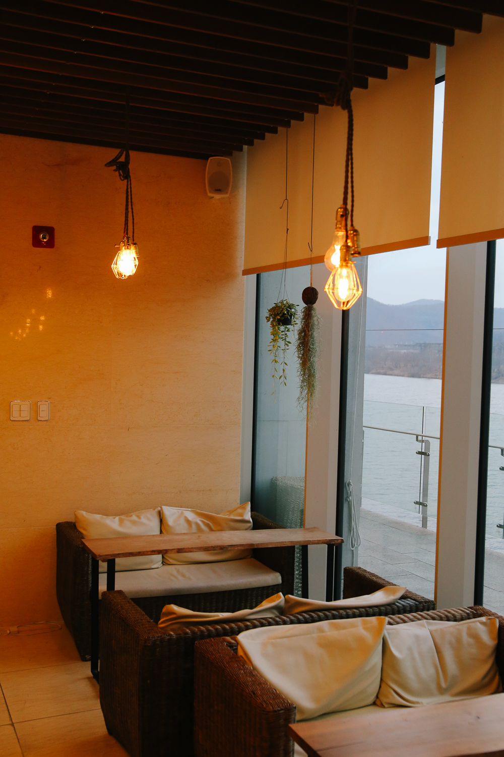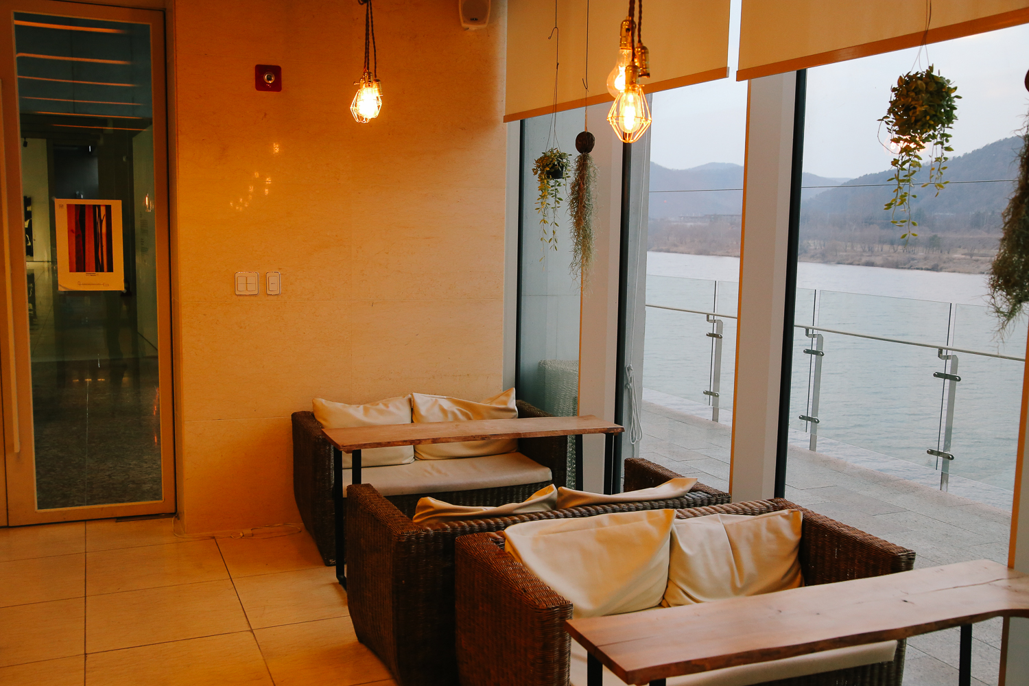 카페 내 통유리 창가로 드넓은 북한강이 보이기 때문에 라탄 소파에 옹기종기 앉아서 창밖 풍경을 감상하여 휴식을 즐기기 좋다.