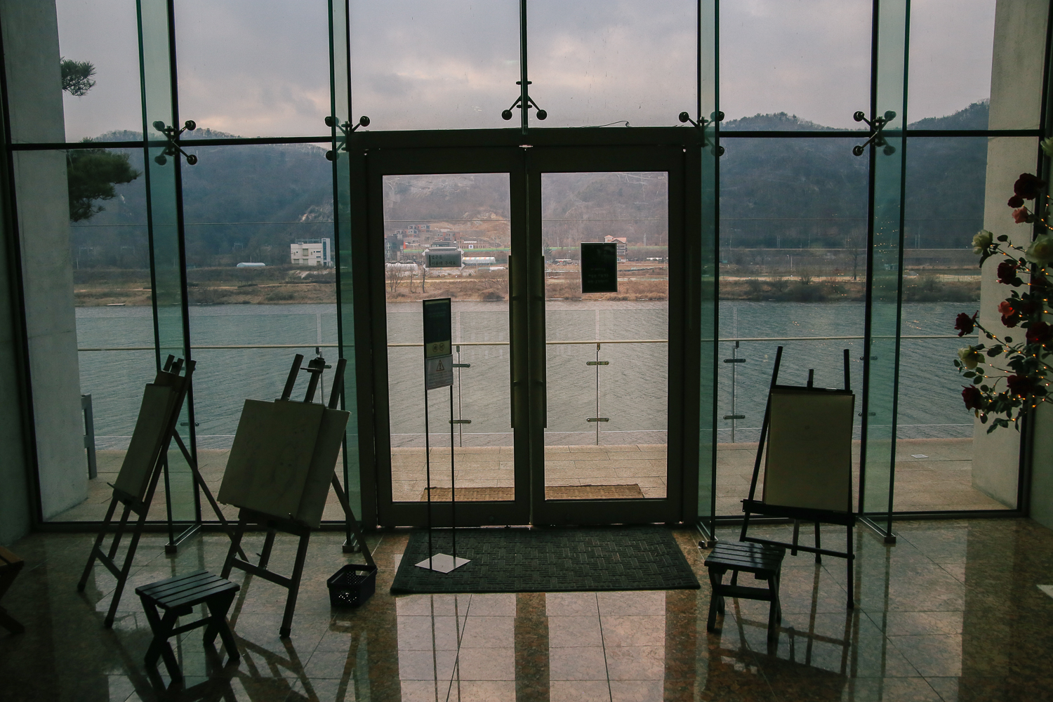 작가 이정웅의 아트 스페이스. 이정웅 작가의 신작을 전시 중인 갤러리와 청평 북한강의 조망을 담고 있는 카페테리아.