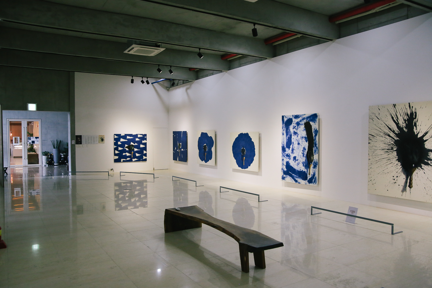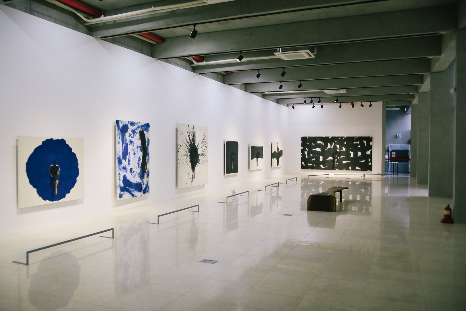 천고가 높은 노출 천장에 화이트톤 벽면에 드문드문 걸려있는 갤러리. 조용히 작품을 감상할 수 있도록 분위기도 연출된 모습이다. 작품별로 가이드라인을 놓아 그곳에서 작품을 감상하도록 해놓았다.