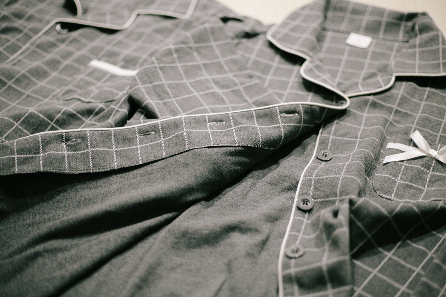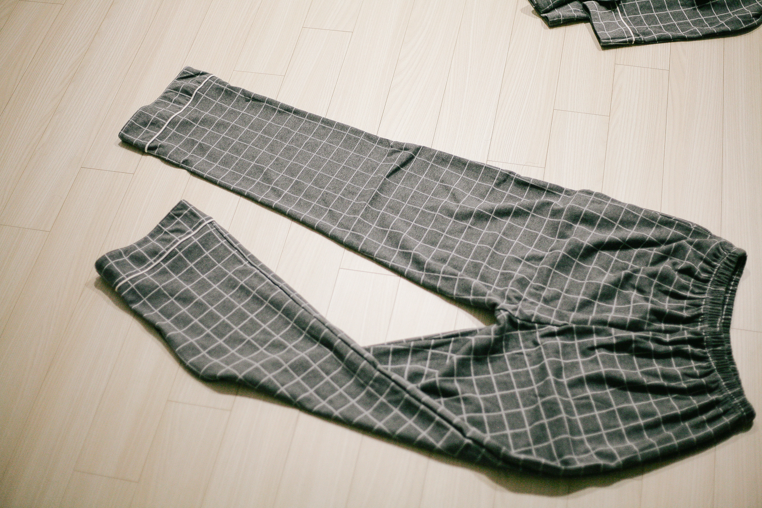 약간의 두께감 있는 그레이 체크 긴팔 잠옷. 사진으로도 안감의 도톰함이 보인다.