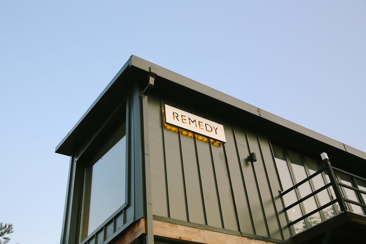 보라빛이 매력적인 네온사인 조명, 레메디(REMEDY) 상호명과 로고를 볼 수 있다.