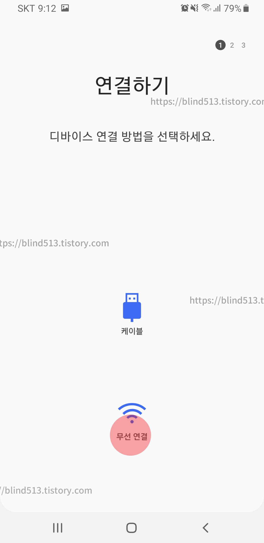 위 Smart Switch 어플 클릭! 구 휴대폰과 신규 휴대폰을 케이블로 연결해서 데이터를 옮길 경우 위 케이블 버튼을 누르고, 그냥 무선 연결로 진행 시 아래 무선 연결 버튼을 누르면 된다.