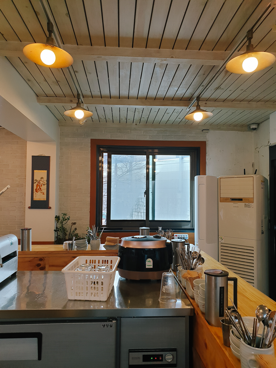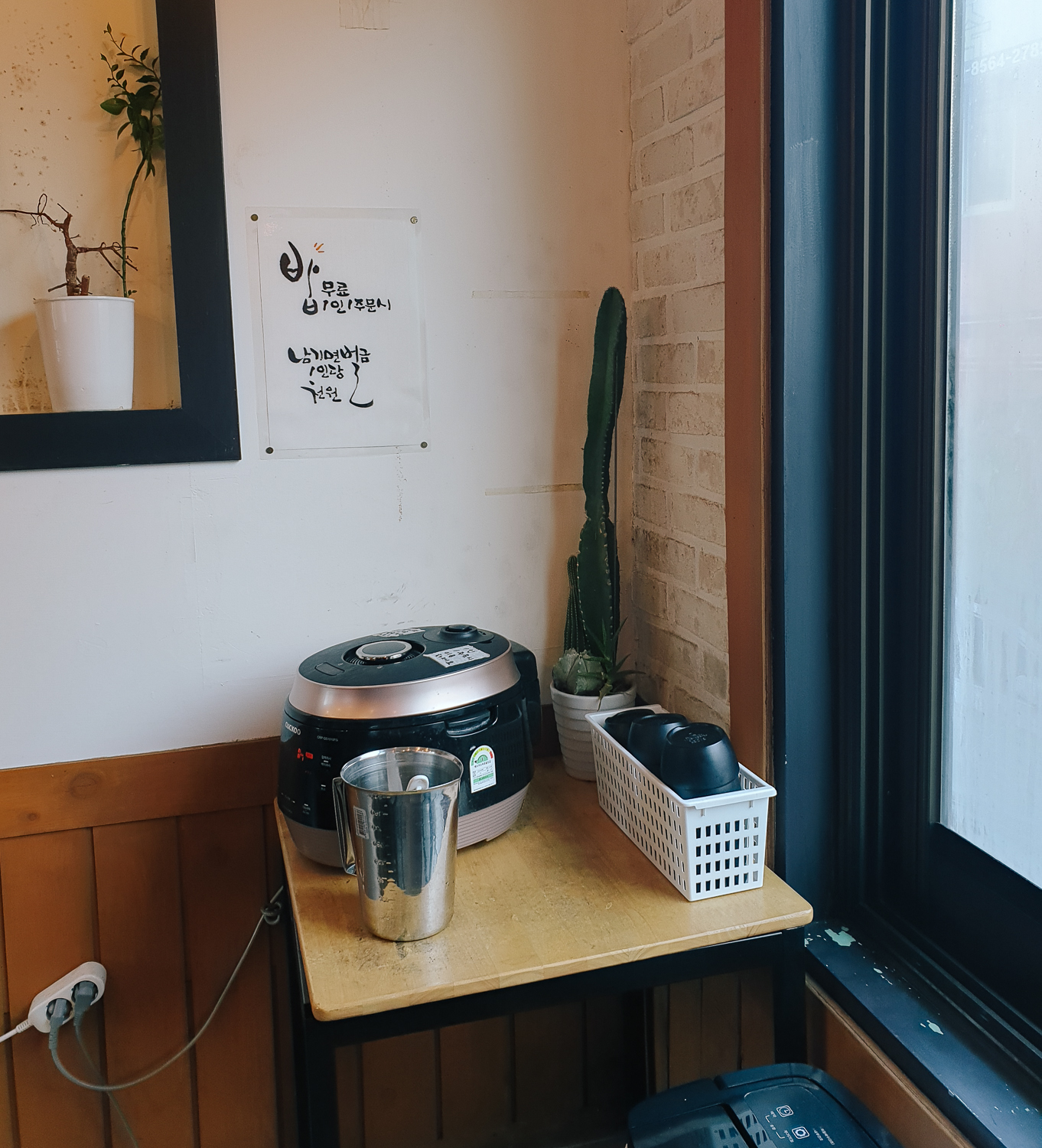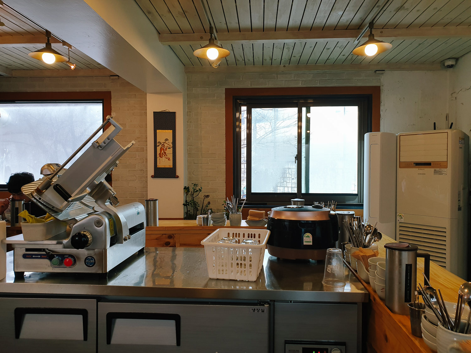 사장님은 가운데서 왔다 갔다 하며 서빙 겸 뒤쪽 주방에서 요리를 한다. 사장님 혼자서 서빙과 요리를 하기에는 최적화된 동선이었다. 대부분 모든 것들이 셀프식으로 세팅하는 거라서 크게 인원이 필요하지도 않았다. 우리는 자리를 잡고, 물과 숟가락, 젓가락, 깍두기를 덜어놓았다.
