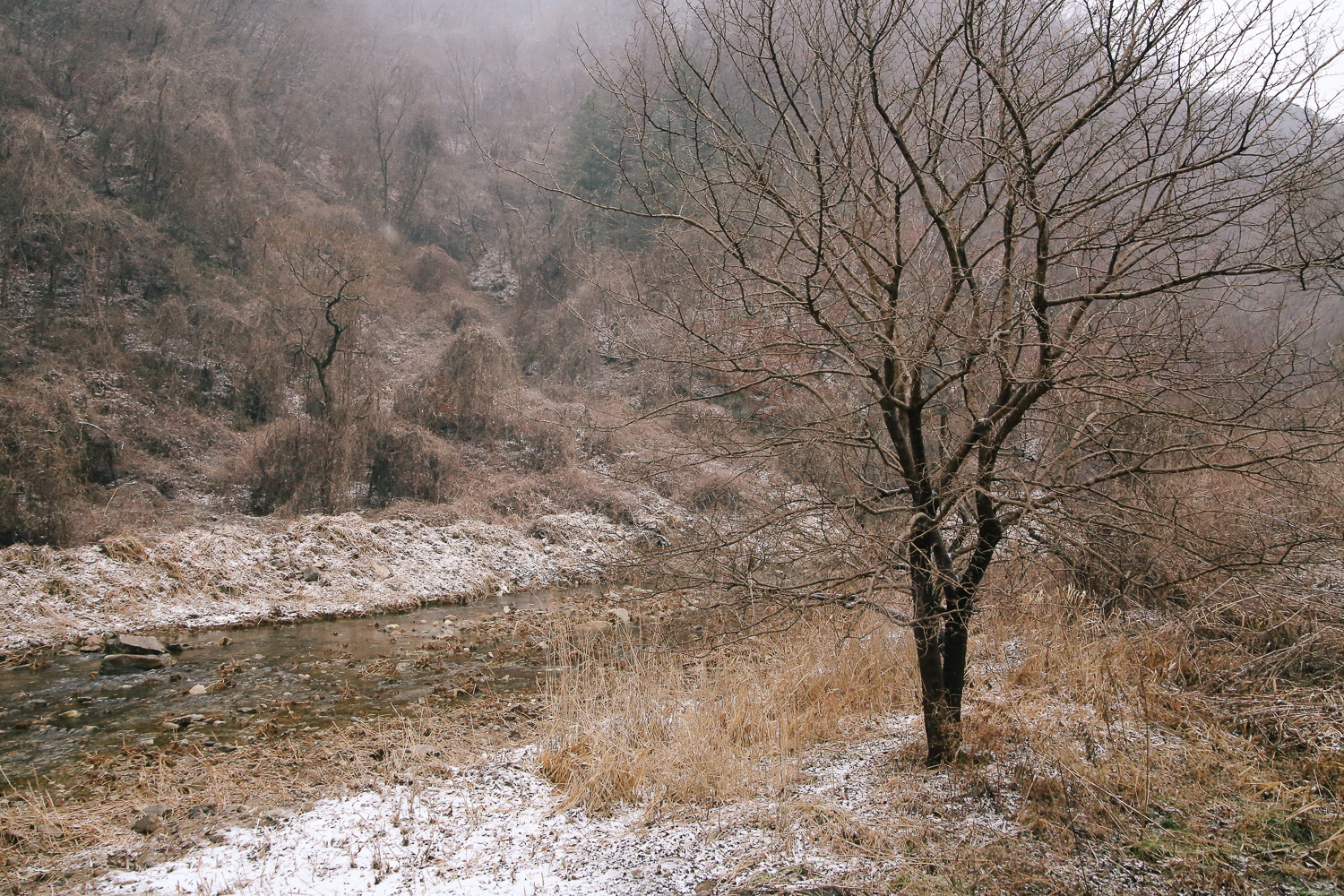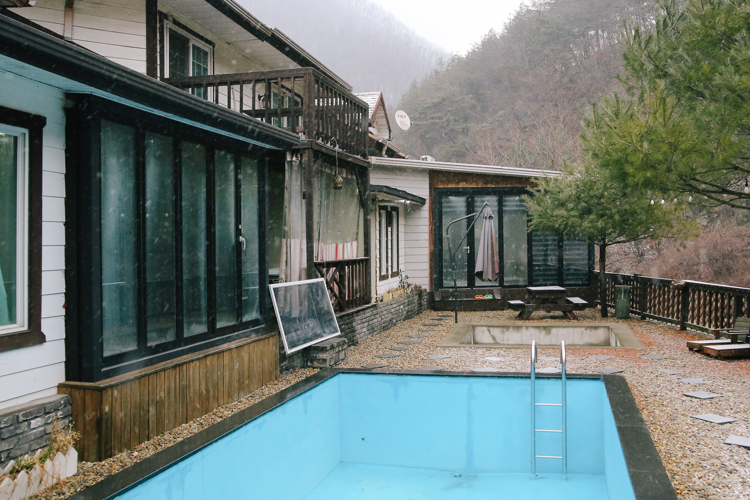 펜션 맞은편에 보이는 계곡과 산이다. 추운 날씨 때문에 앙상한 나뭇가지와 메마른 계곡이라 아쉬웠지만 계절이 좋은 날에는 피톤치드가 느껴지는 힐링 공간이라고 생각된다. 야외 풀장도 재밌을 것 같고.
