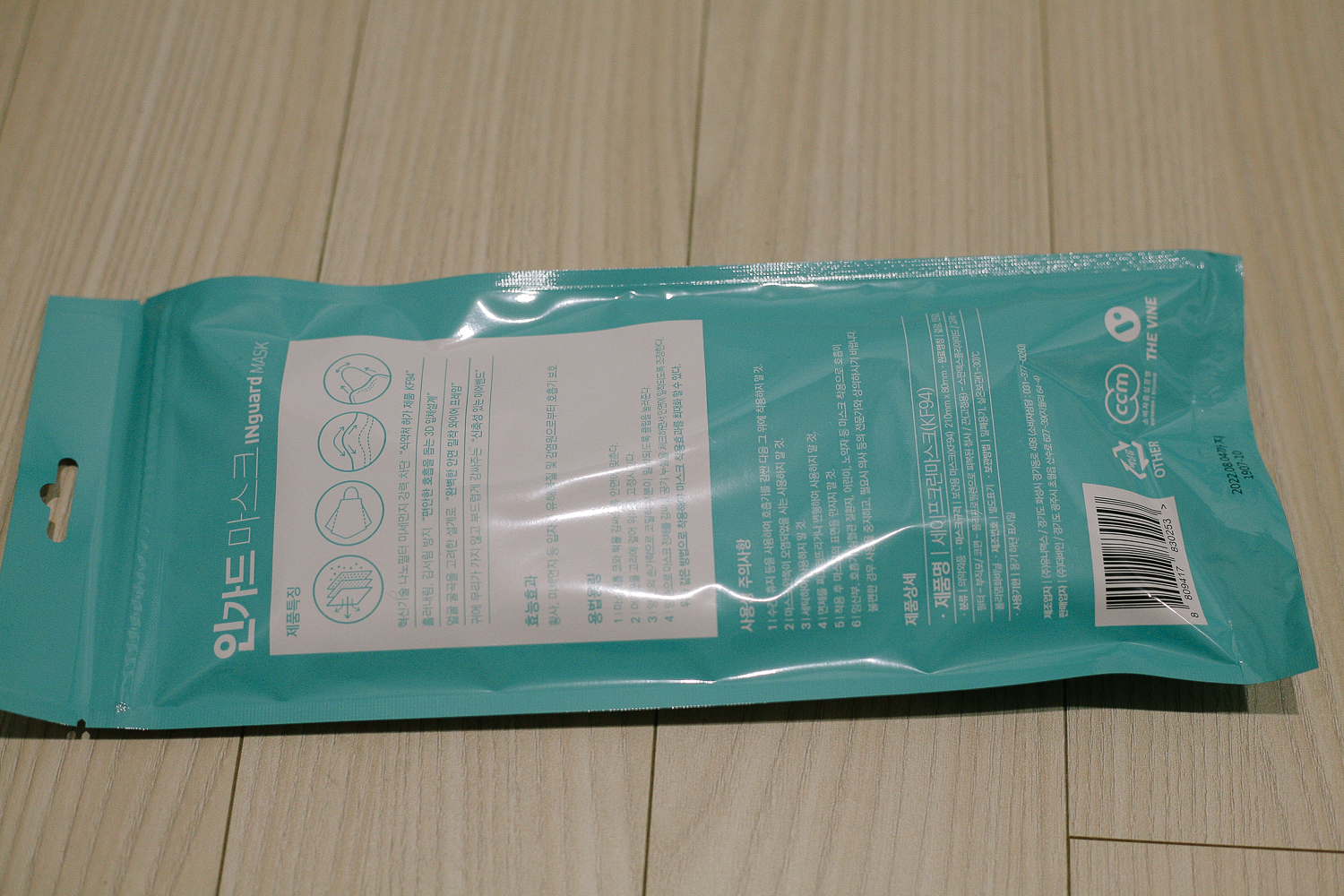 이 제품 역시 KF94 차단 필터이며, 안면을 잡아줄 수 있도록 와이어 프레임이 있는 마스크다. 저렇게 한 팩에 5매가 들어가 있는 제품이다.