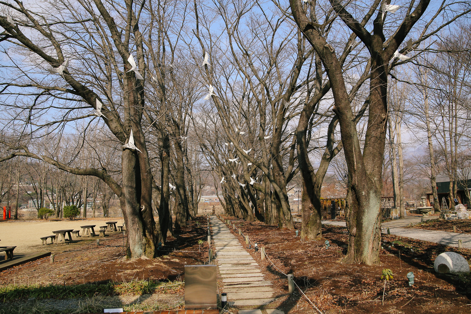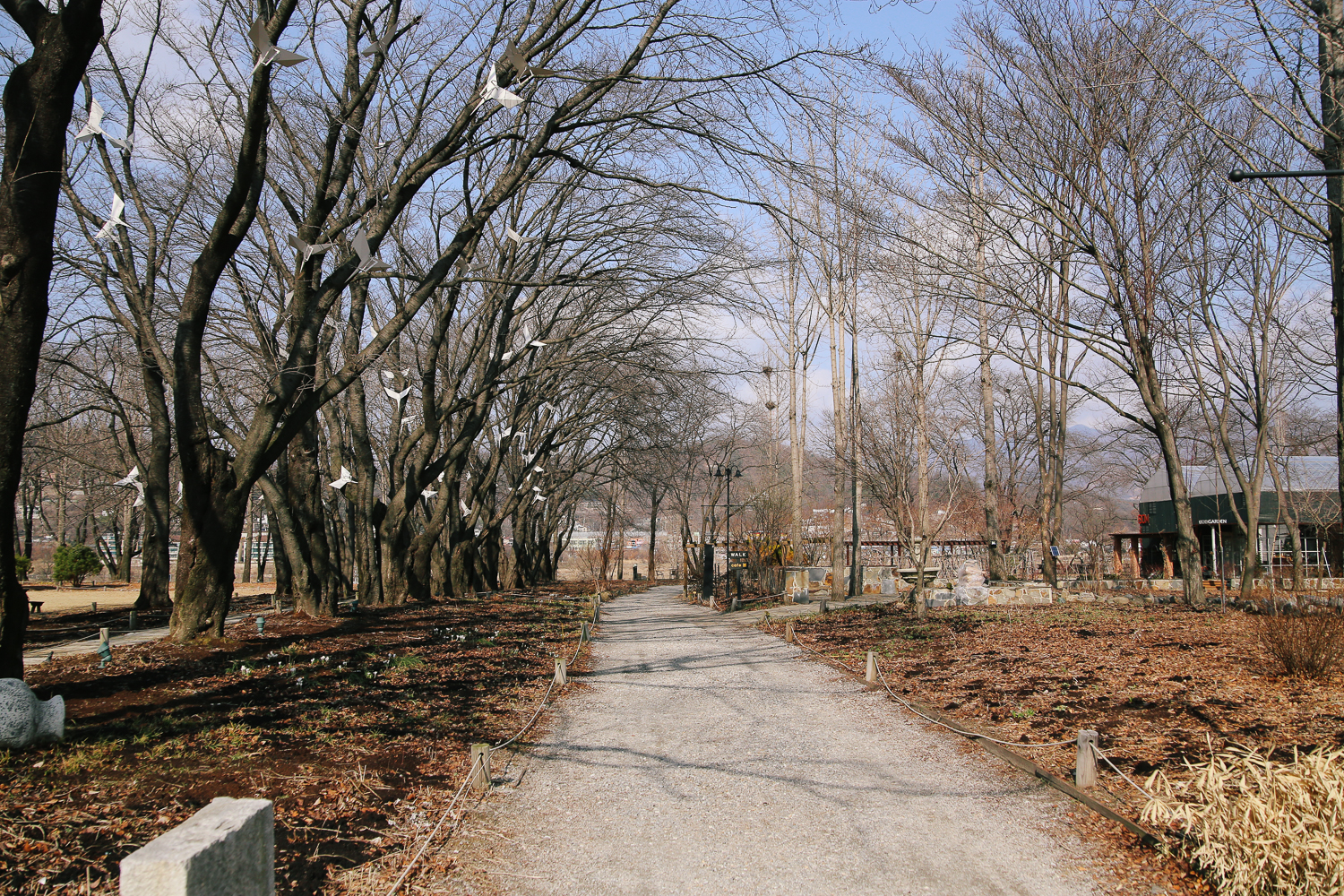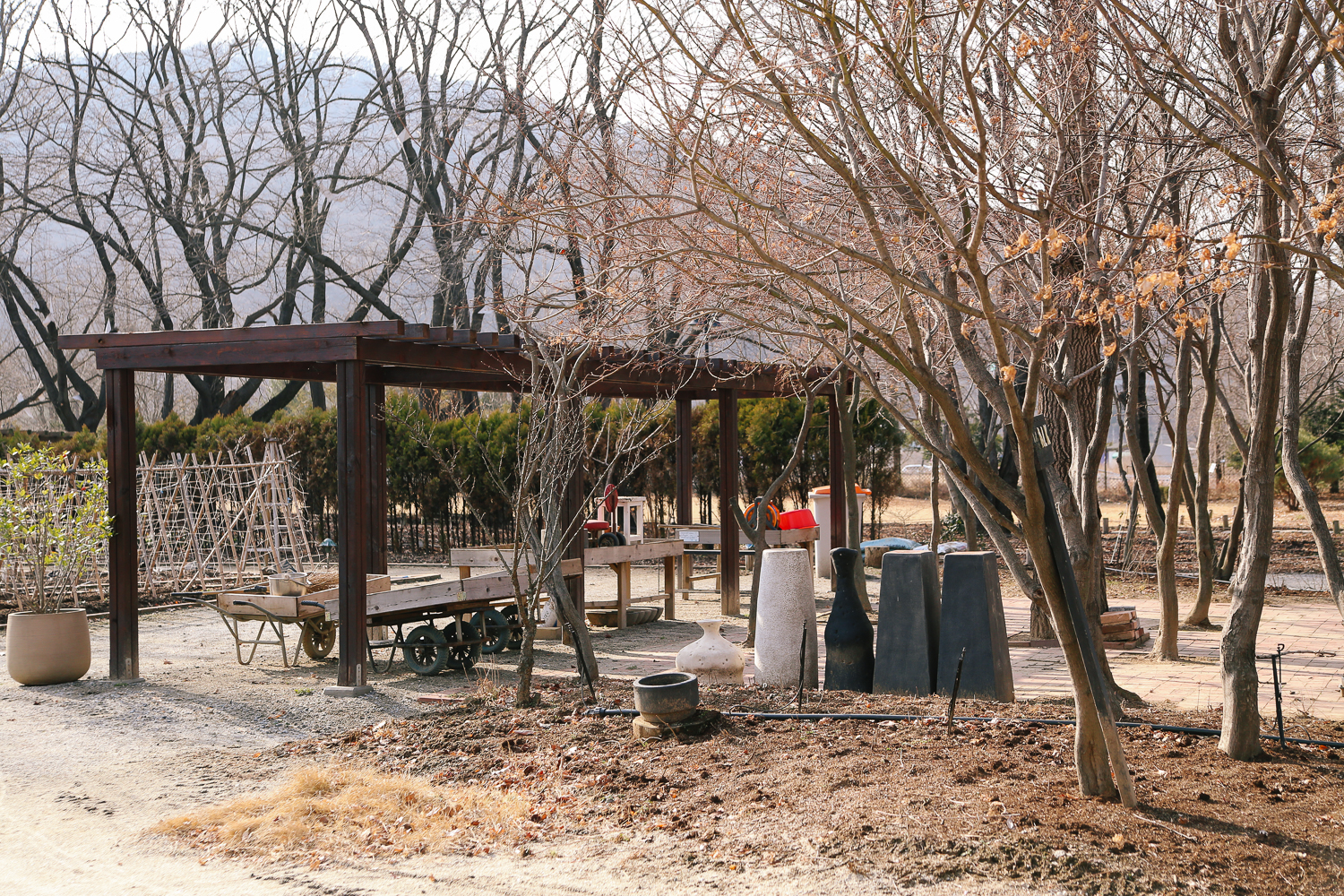 음료를 받아들고 슬슬 정원을 지나 카페 겸 화원 쪽으로 이동했다. 역시 아직은 앙상한 나뭇가지만 가득한 나무지만 흰색 새를 표현한 조형물이 걸려있던 터라 더 돋보이고 나름의 매력이 느껴지는 풍경이다.