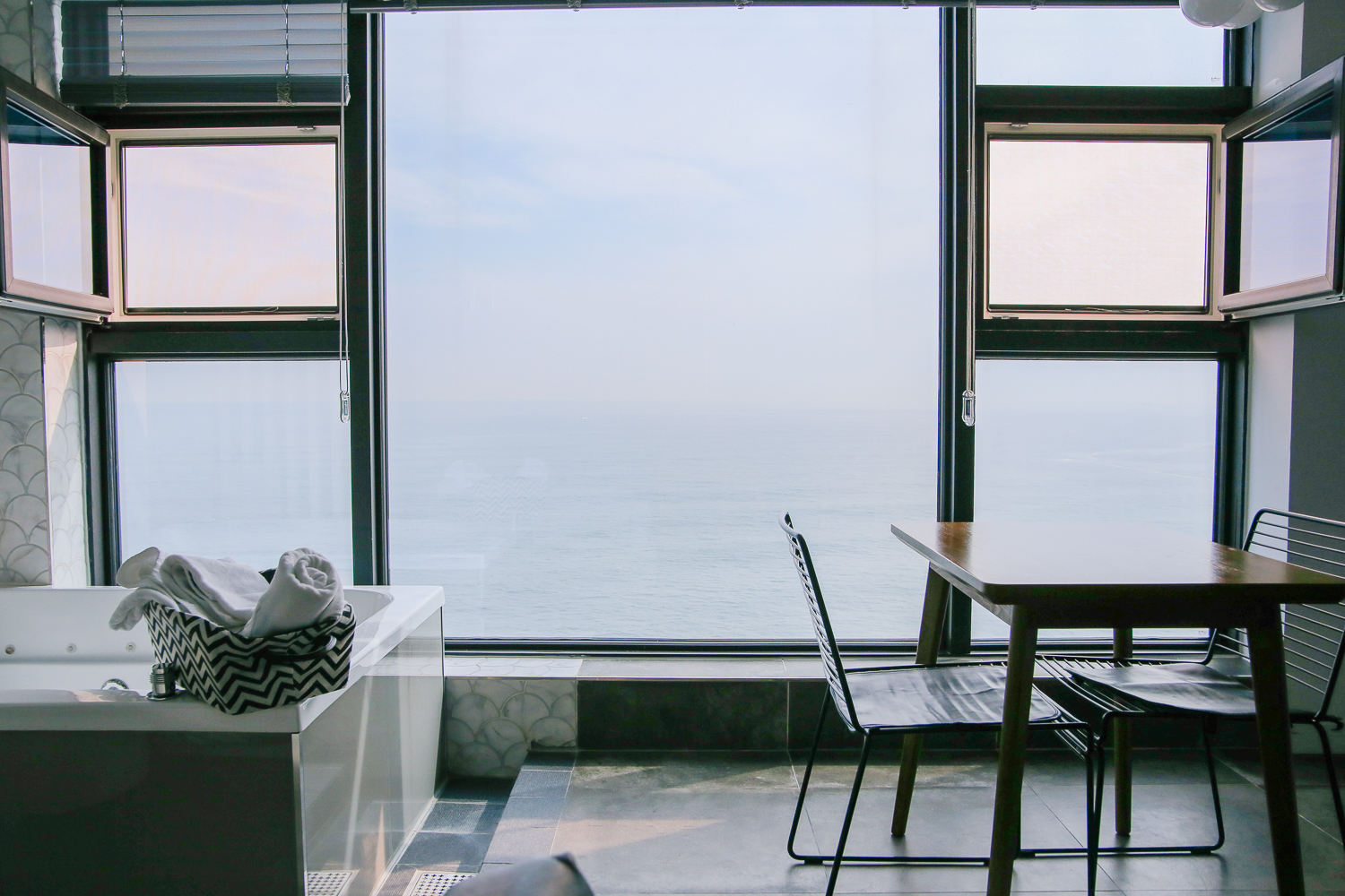 큰 타올 2개, 작은 타월 3개 제공해준다. 스파를 할 때는 공기청정기를 틀고 사용해야 습하지 않다. 하지만 우리는 그냥 창문을 열어놓고 해서 크게 상관없었다. 창문을 열어놓으면 절벽을 치는 파도 소리가 실감 나게 들린다. 자연의 백색소음이라고 할까, 테이블에 앉아서 철썩철썩 부딪히는 파도 소리를 들으며 휴식을 취하기 매우 좋다. 채광 또한 굿굿!