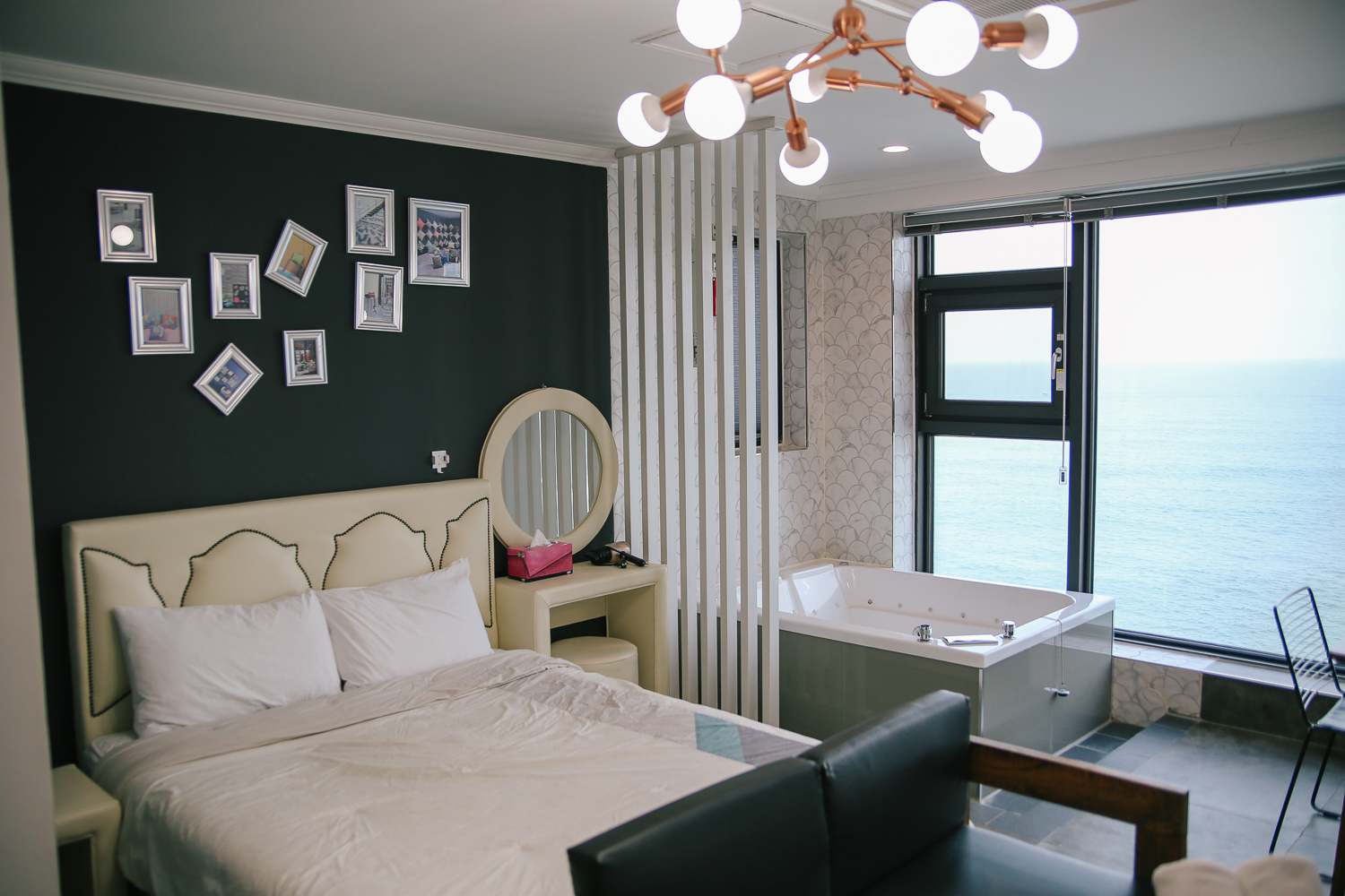 우리가 예약한 602호는 원룸형으로 주방, 스파, 침대 등이 적당한 공간에 배치되어 있는 형태였다. 이곳 펜션에는 다양한 인테리어가 있는데 이곳을 예약한 것은 아내가 티비를 보는 것을 좋아해서 침대와 스파가 붙어있는 방 구조를 찾았다. 이곳이 찰떡이었다! ㅎㅎ