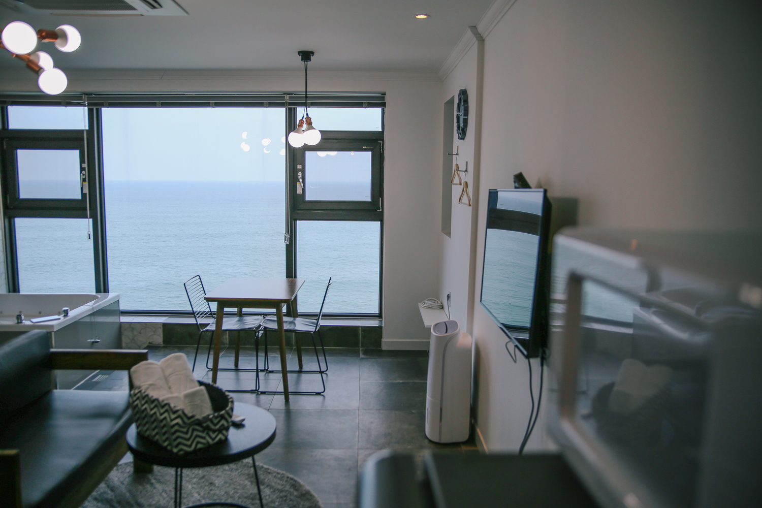 이곳 역시 창밖에 바로 오션뷰가 보이는 펜션이며, 스파도 있는 곳이었다. 그래도 신축인 펜션이라 깔끔한 인테리어로 꾸며져 있었다. 우리는 제일 윗층인 602호를 예약했다. 라온스파펜션 홈페이지와 블로그 후기로만 잠깐 봤을 때 먼발치에 바닷가가 보이는 곳인 줄 알았는데 방문하고 보니, 높은 절벽 쪽에 위치해있어 넓은 바다를 내려다보는 느낌의 뷰였다. 때문에 모래사장은 보기 힘들다고 생각하면 이해가 쉽다.