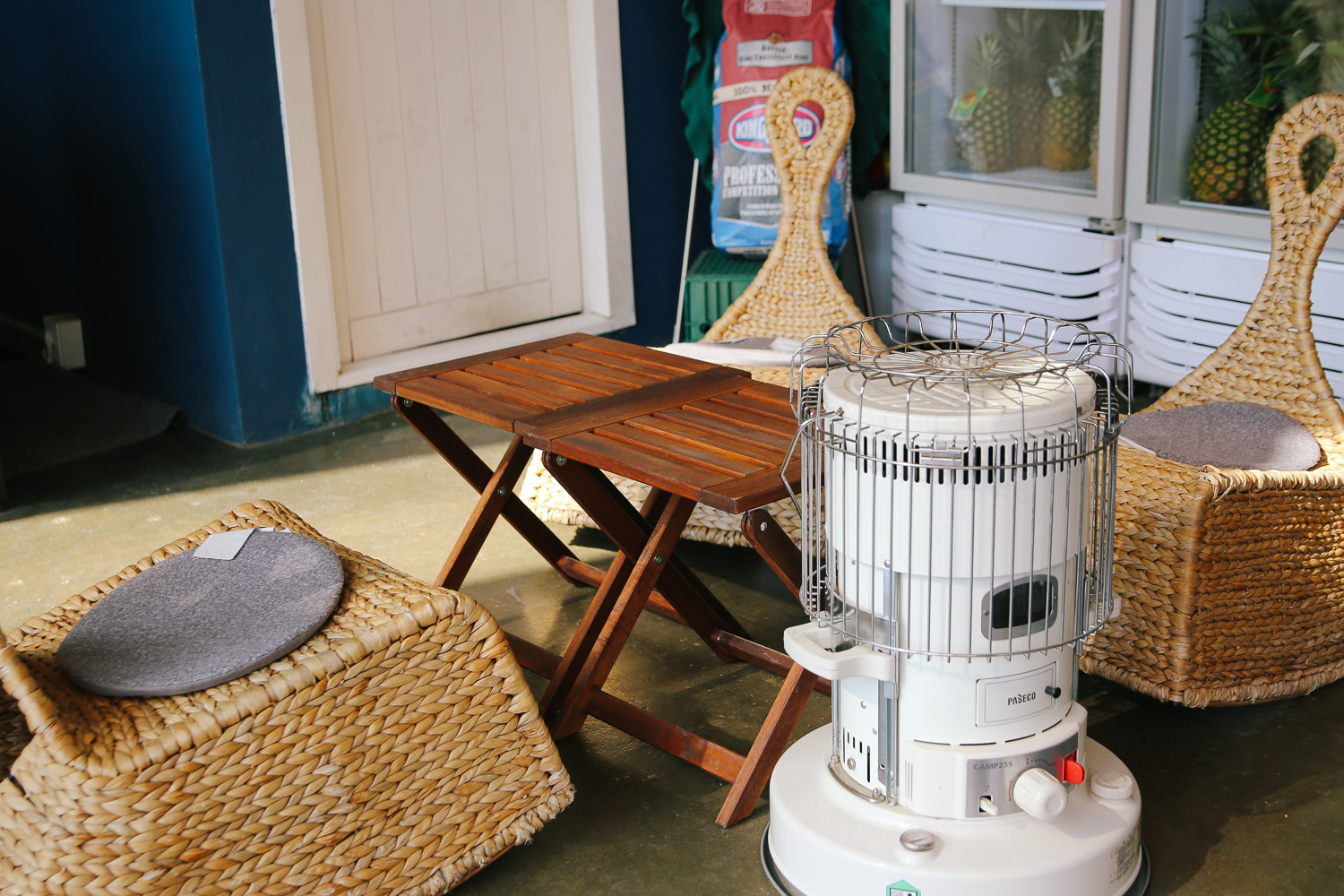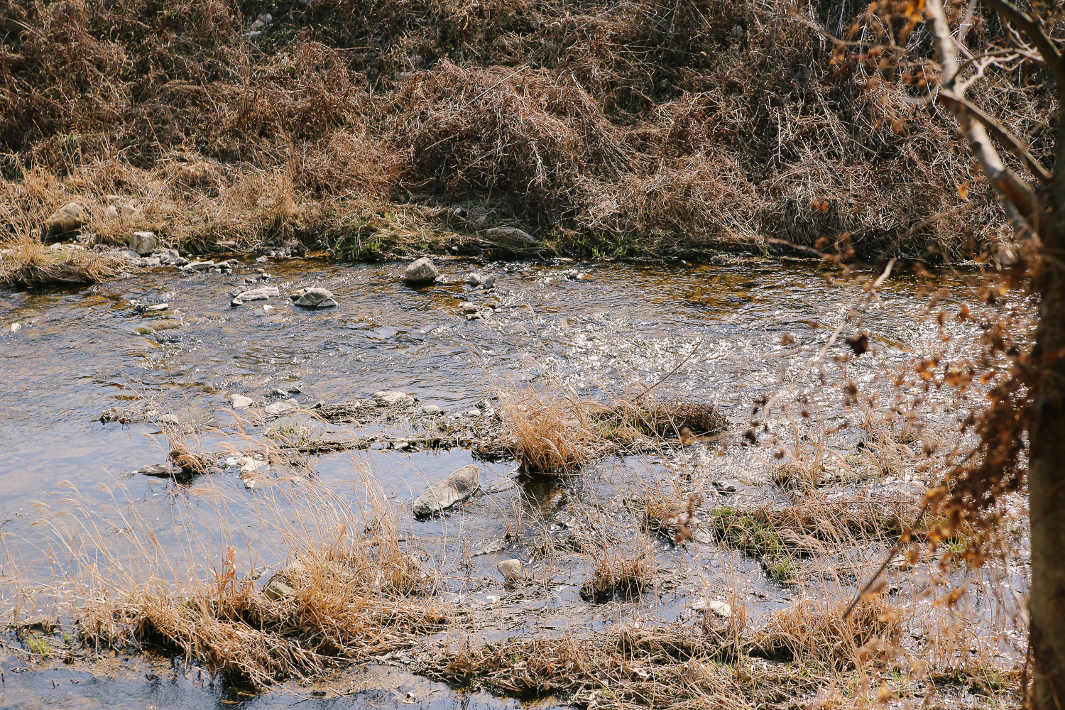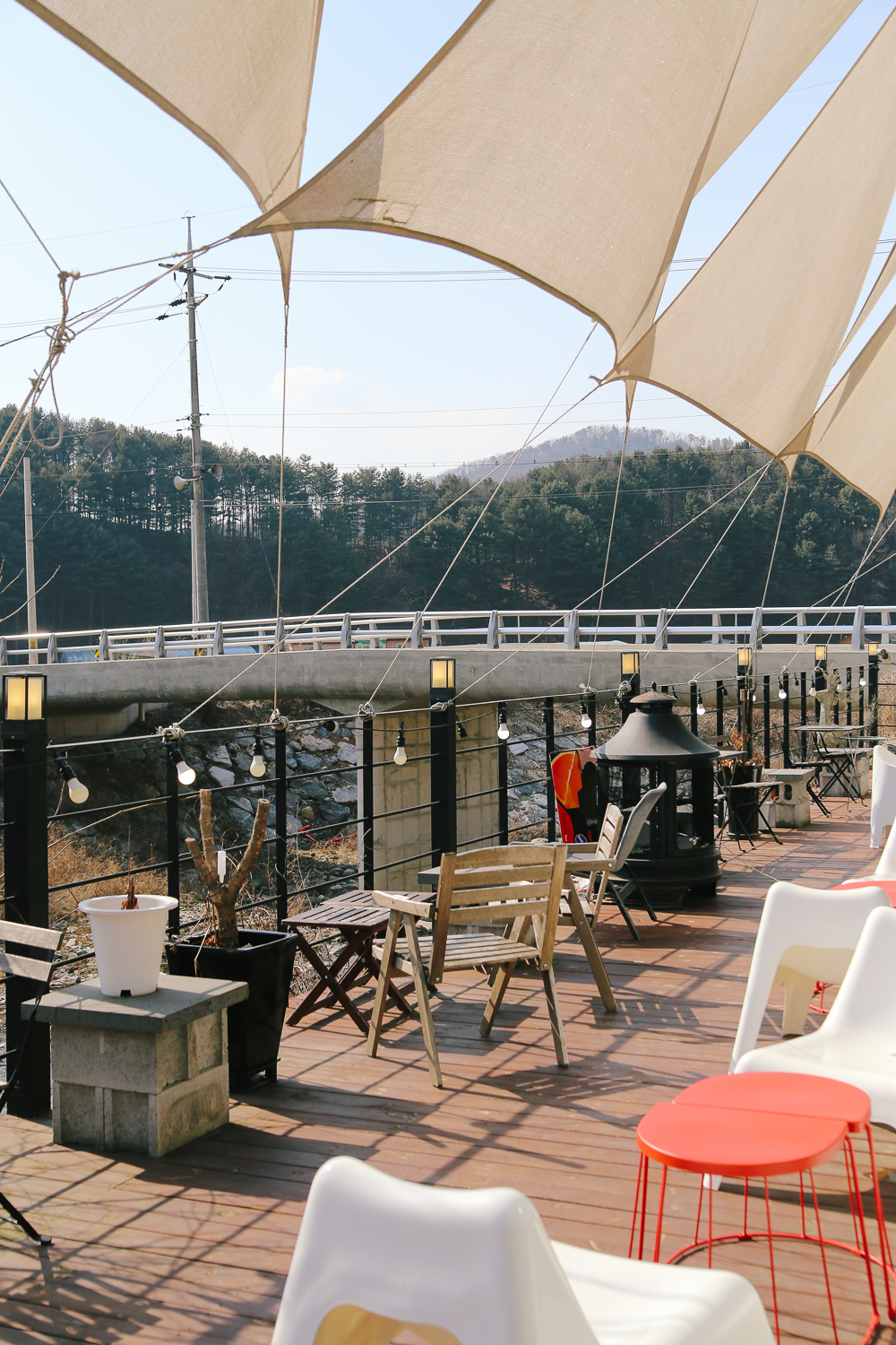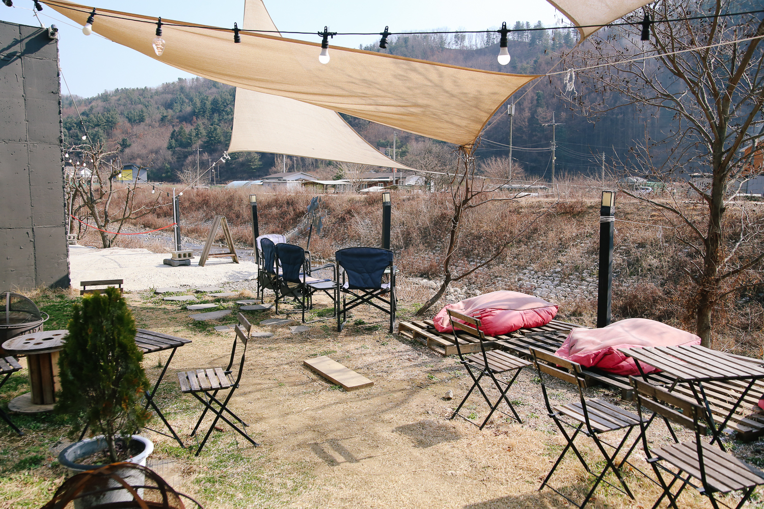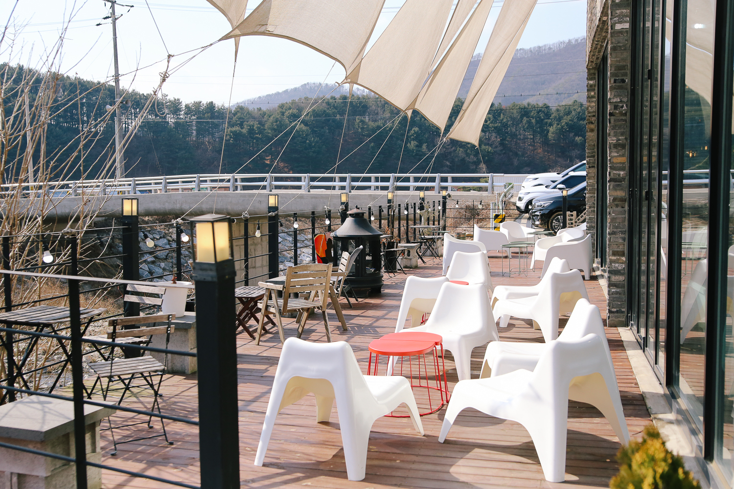 공간 하나하나 허투로 쓰지 않고 의자와 테이블로 자리를 만들어놓은 모습이다. 공간에 비해 굉장히 많은 인원을 수용할 수 있는 자리가 세팅되어 있었다. 맞은편에 흐르는 시냇물. 아직 풀잎들이 올라오지 않아 조금 황량해 보였지만 볕이 좋아서 그런 느낌은 덜했다.
