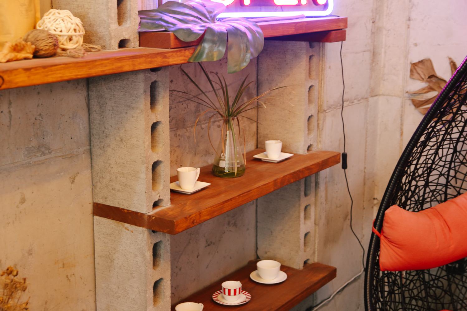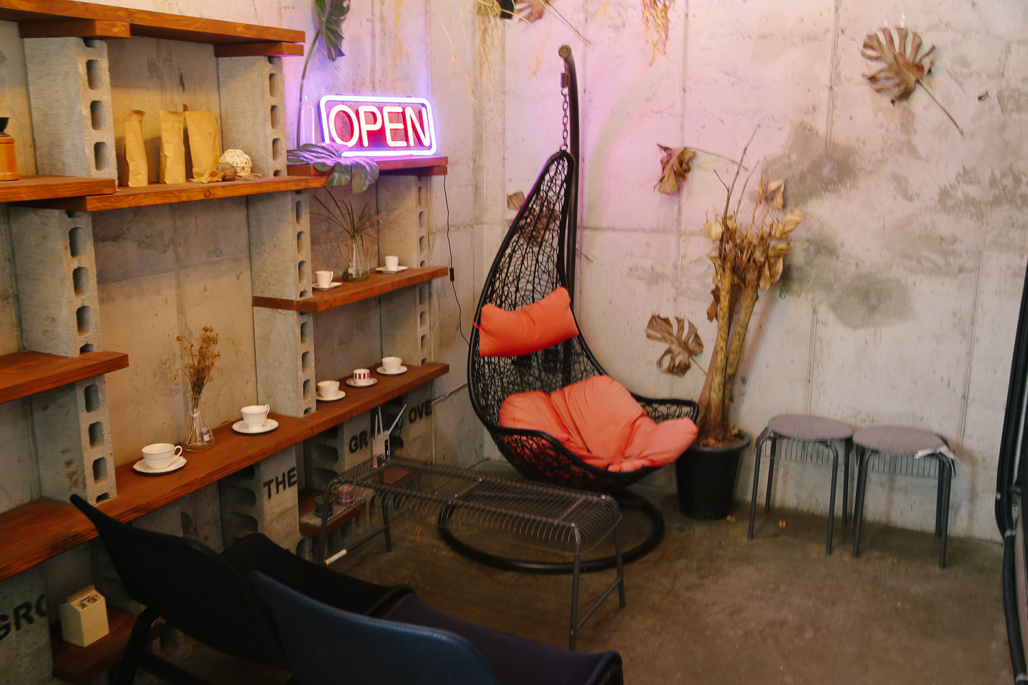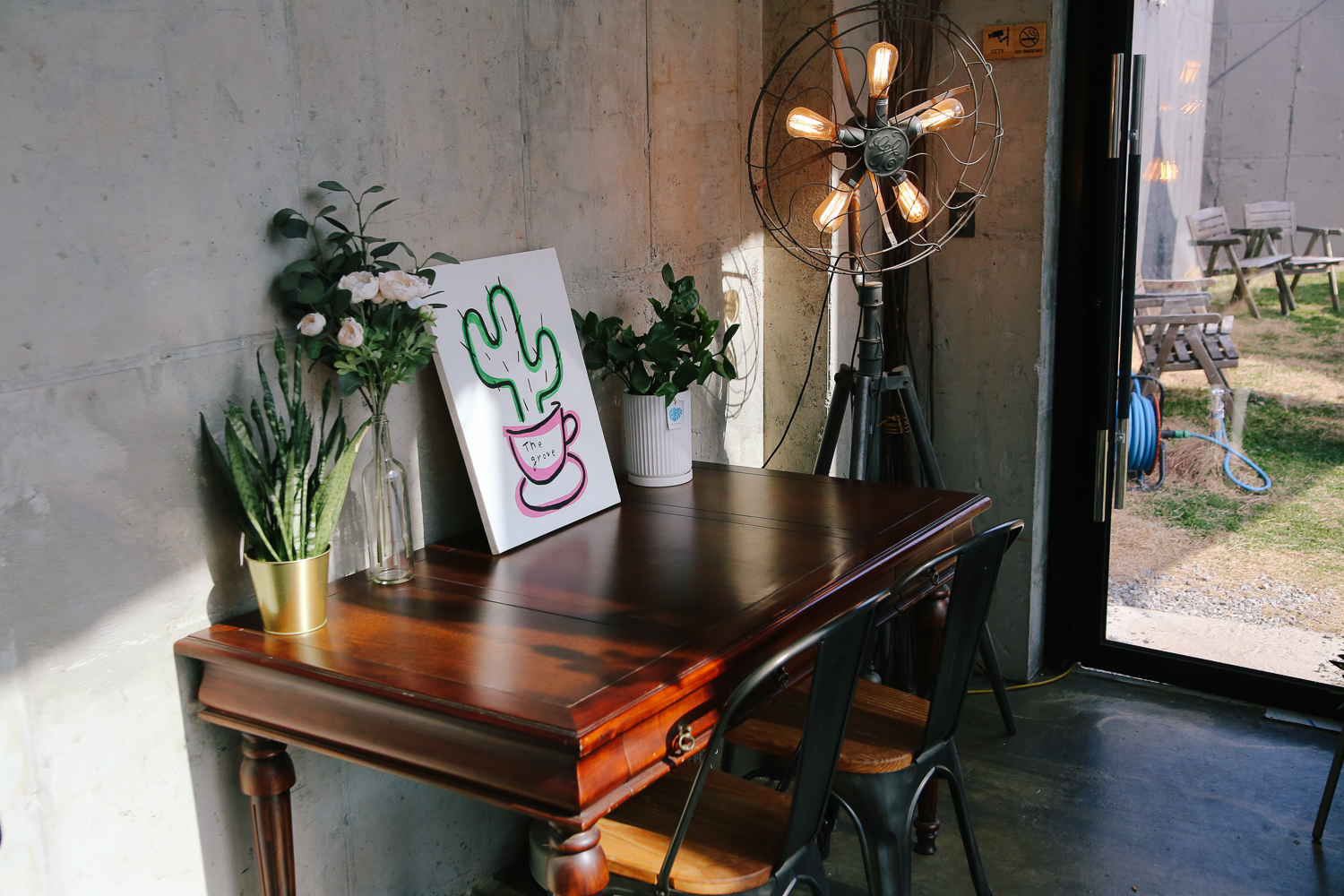 외부 테라스 쪽으로 나가는 입구쪽에 위치한 자리. 앤티크 한 가구와 화분이 조화로운 모습이다. 그리고 빈티지하고 아날라로그 한 조명까지!