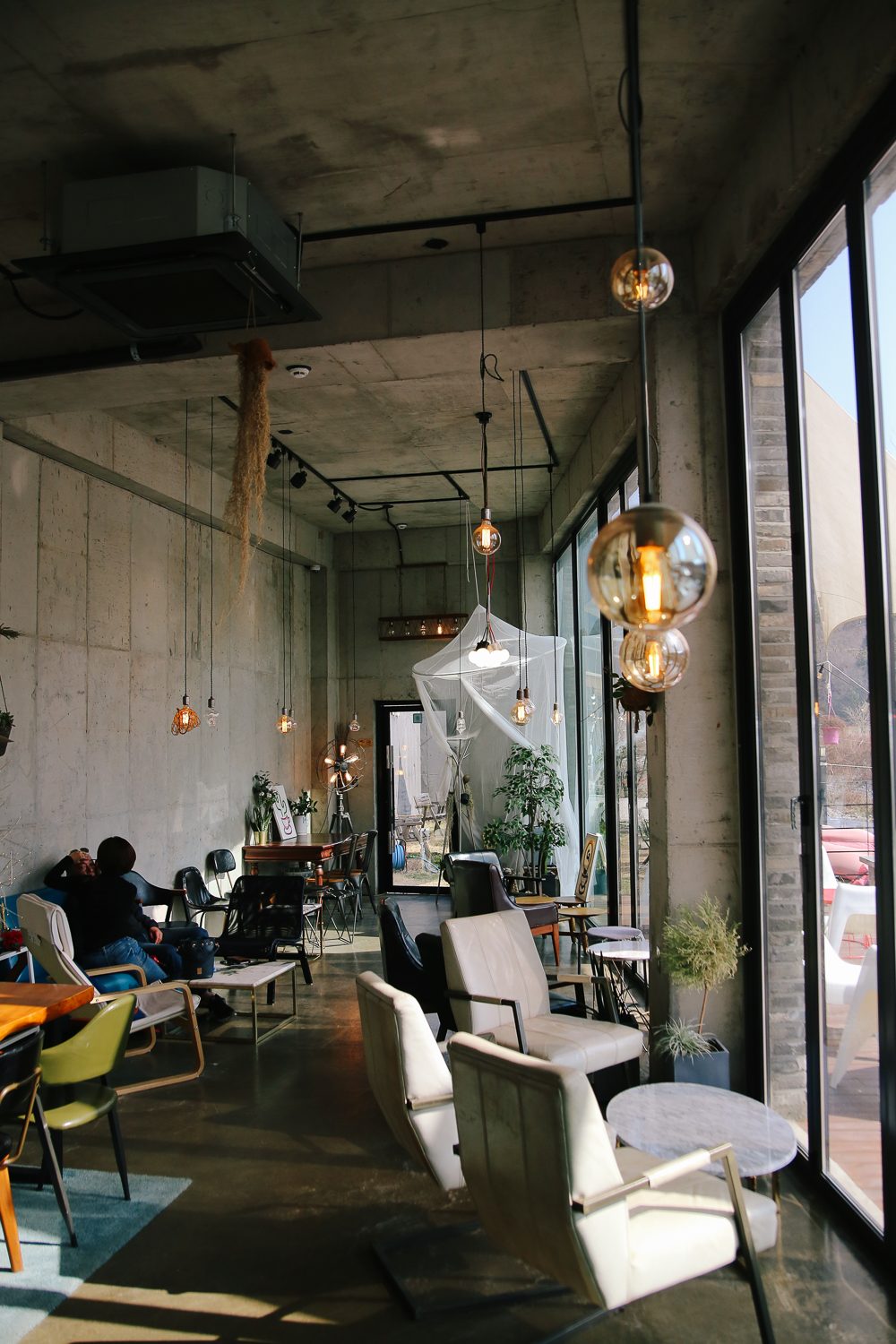 1층 내부 전경 모습. 건물 외부에서 봤을때는 옥상 쪽이 예쁠 것 같았는데 아쉽게도 출입이 제한되어 있었다ㅠㅠ 1층에는 다양한 인테리어의 테이블 자리가 있었다. 통유리로 되어 있어 채광도 너무 좋았다.