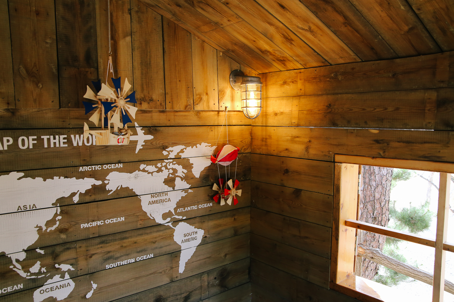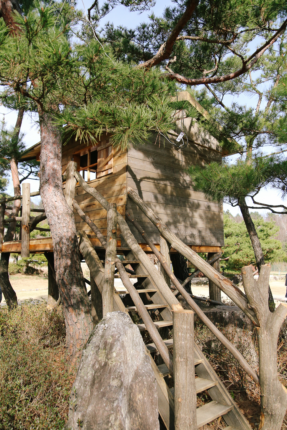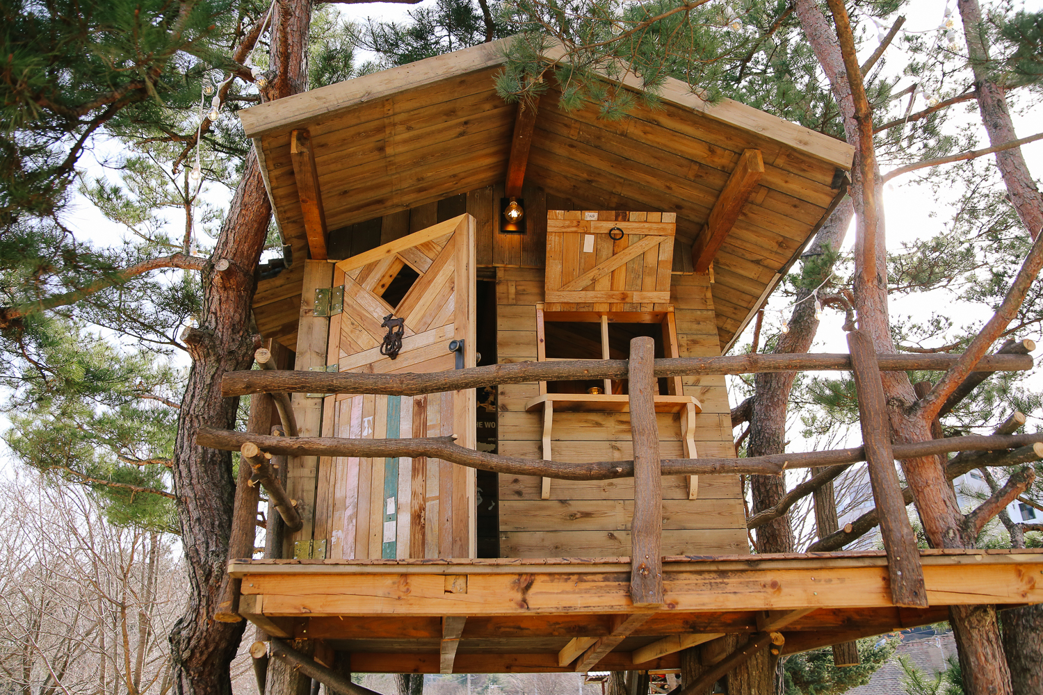 정원 쪽으로 나가면 바로 보이는 원목으로 만든 집이 있다. 소나무 사이에 높이를 올려 만든 아지트 같은 원목 집. 적당히 아담한 공간으로 이미 아이들의 아지트가 되어 있었다. 이때부터 내부가 너무 궁금해서 꼭 들어가고 싶었다^^;;