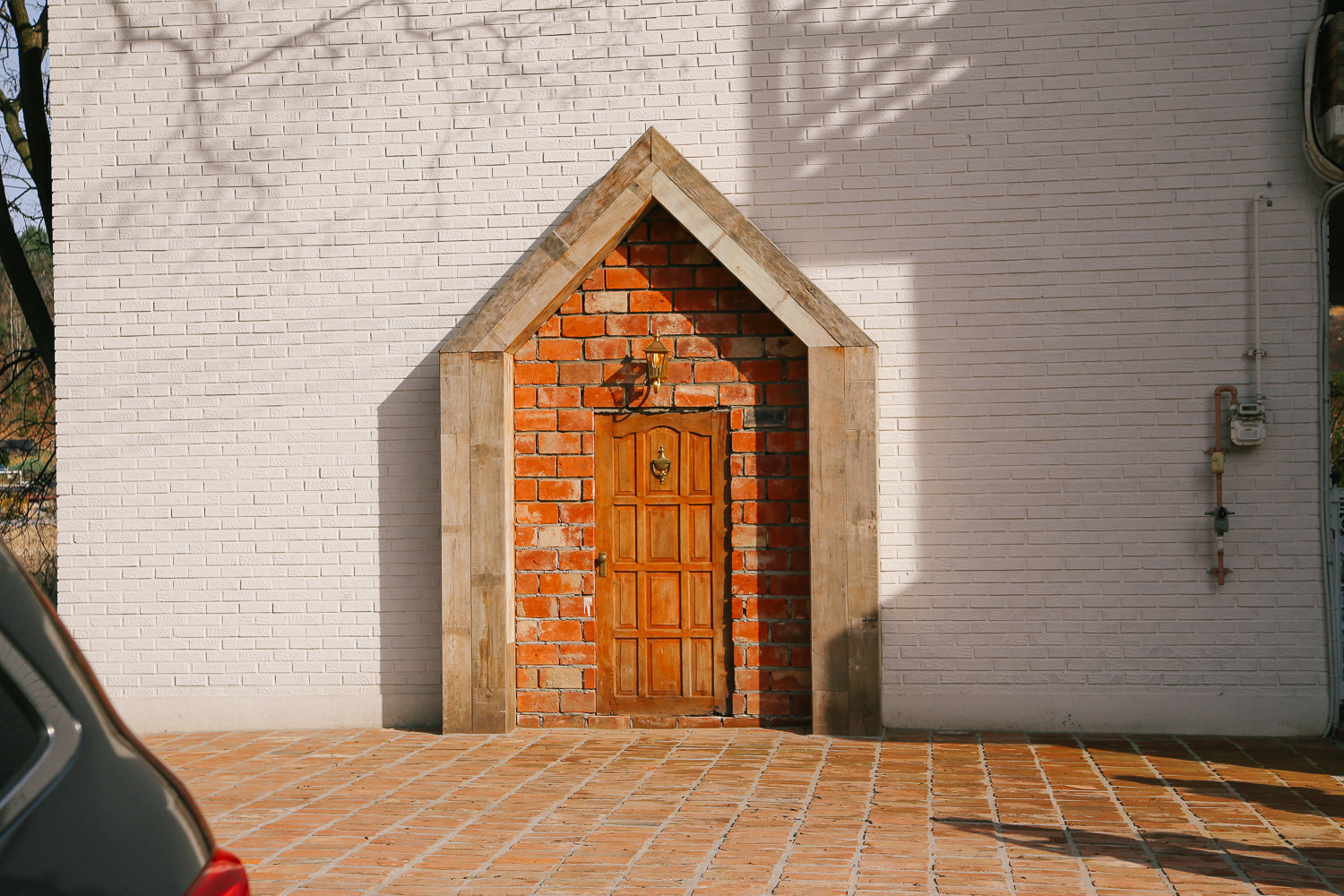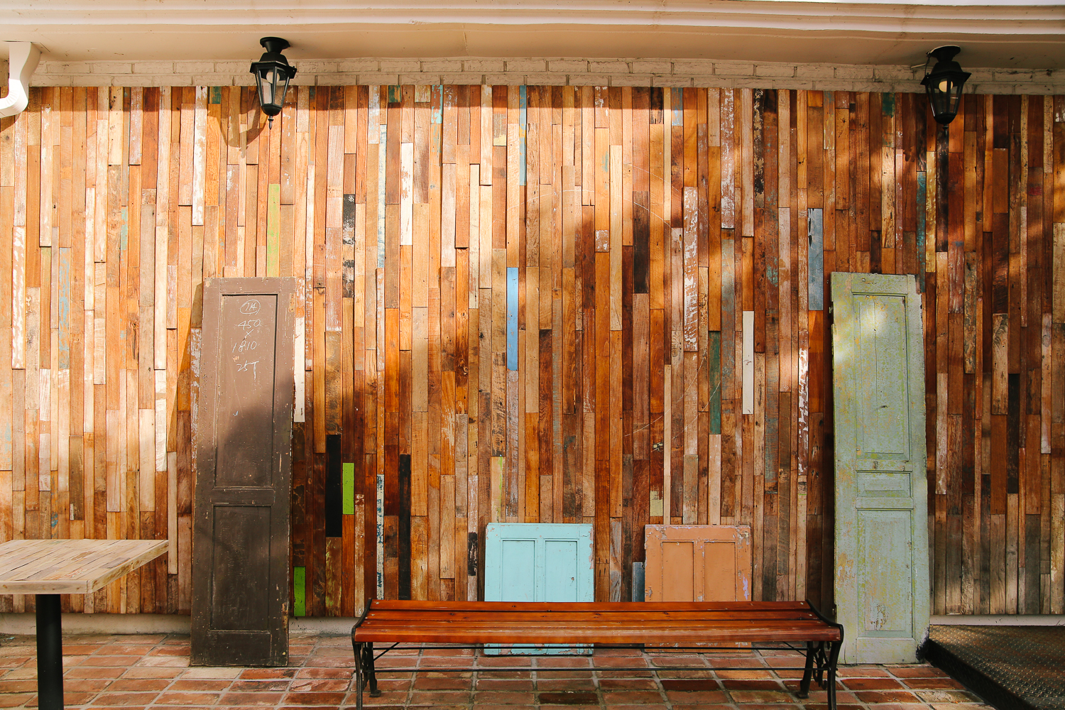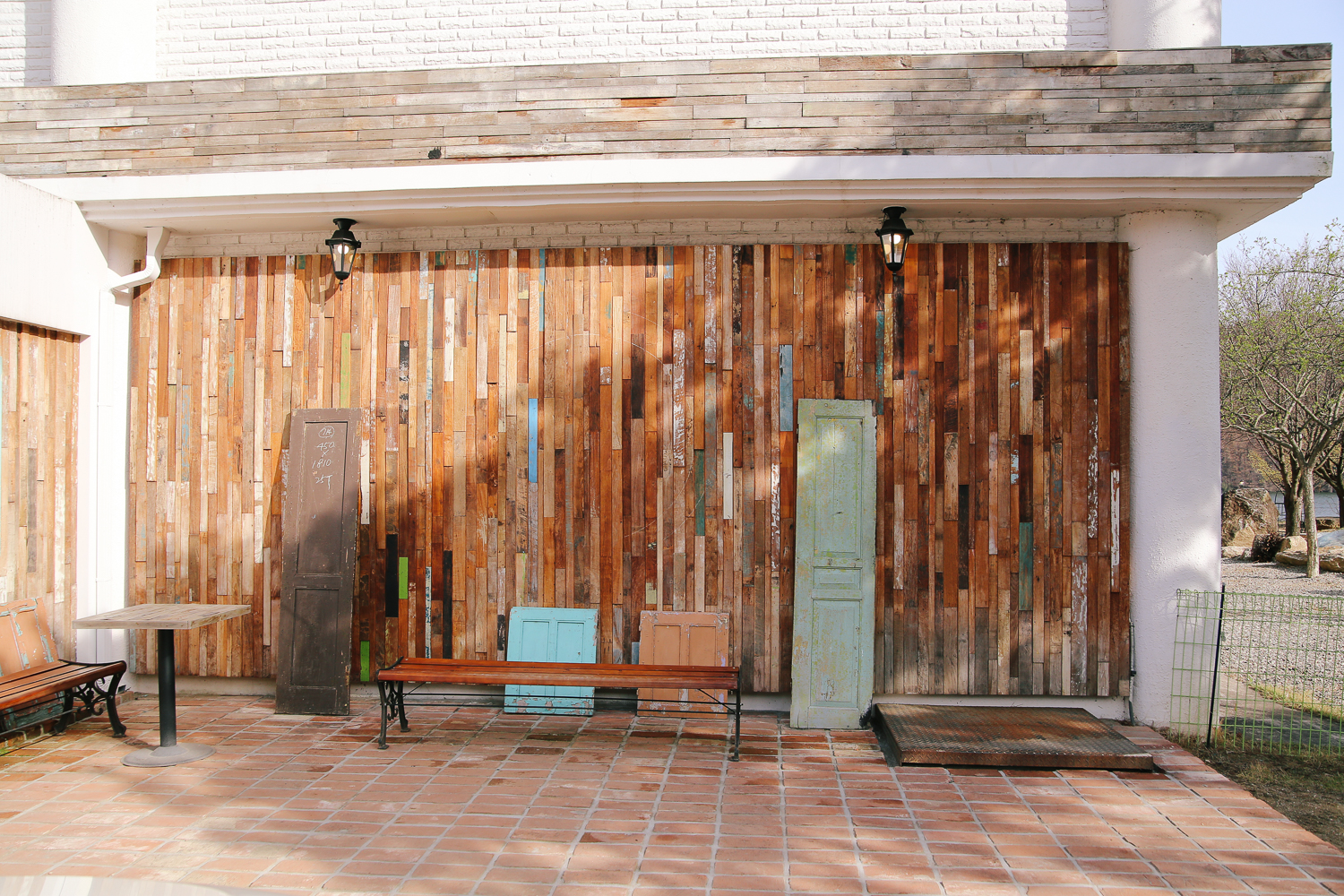 건물 바깥 쪽에 원목 조각들도 덧대어 만든 벽면이 참 예뻤다. 벤치 뒷쪽에 덩그러니 기대어 있는 문도 색상을 칠해놓아 하나의 작품을 보는 듯 했다.