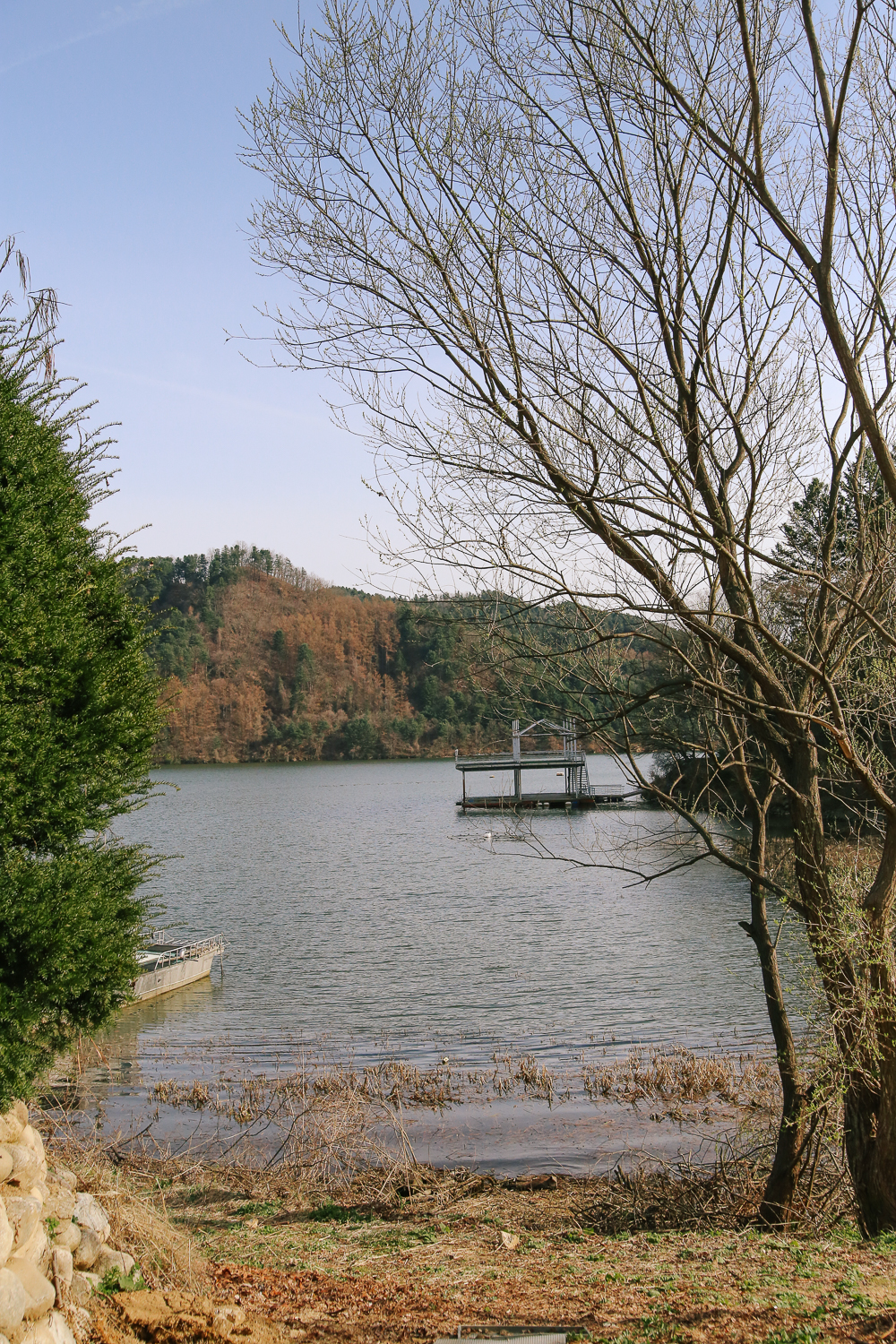 정원의 전체적인 뷰. 저 멀리 산 능선과 북한강이 있다. 그리고 정원에는 별관이 3채가 있는데 이곳에도 자리할 수 있는 테이블이 있다. 별관 한 곳에 들어가봤는데 그곳도 굉장히 예쁘게 꾸며져 있었다. 창가 쪽 테이블 1개와 중앙에 단체석으로 사용할 수 있는 테이블이 있었다. 별관은 창가를 마주하고 있는 곳이 상석이었다. 모두들 참고하시길 :)