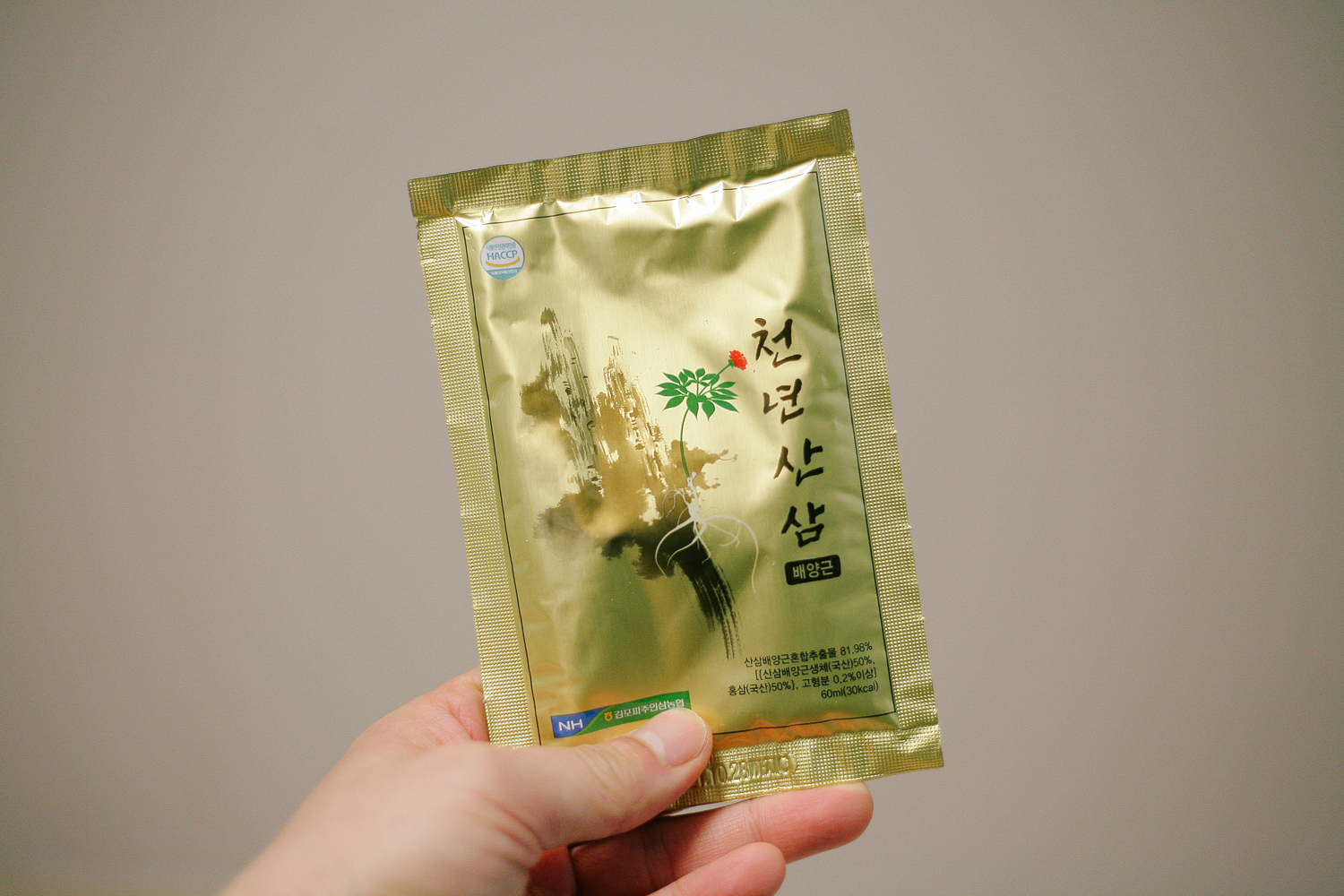 회사에서 받게 된 천년 산삼 배양근. 보기에도 고급스러워 보이는 패키지. 금색 펄 느낌이 나는 표면과 한국화가 그려져 있다.