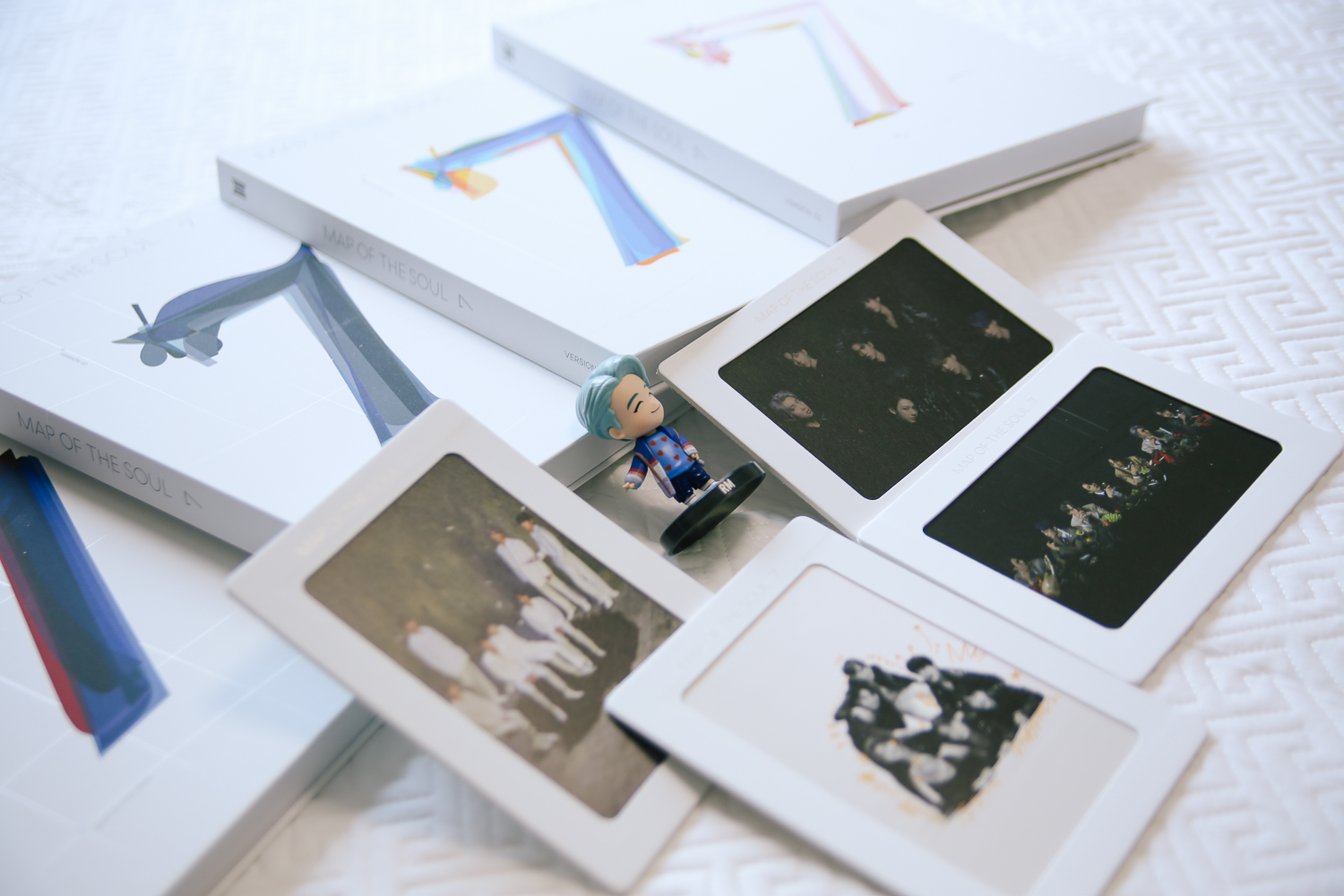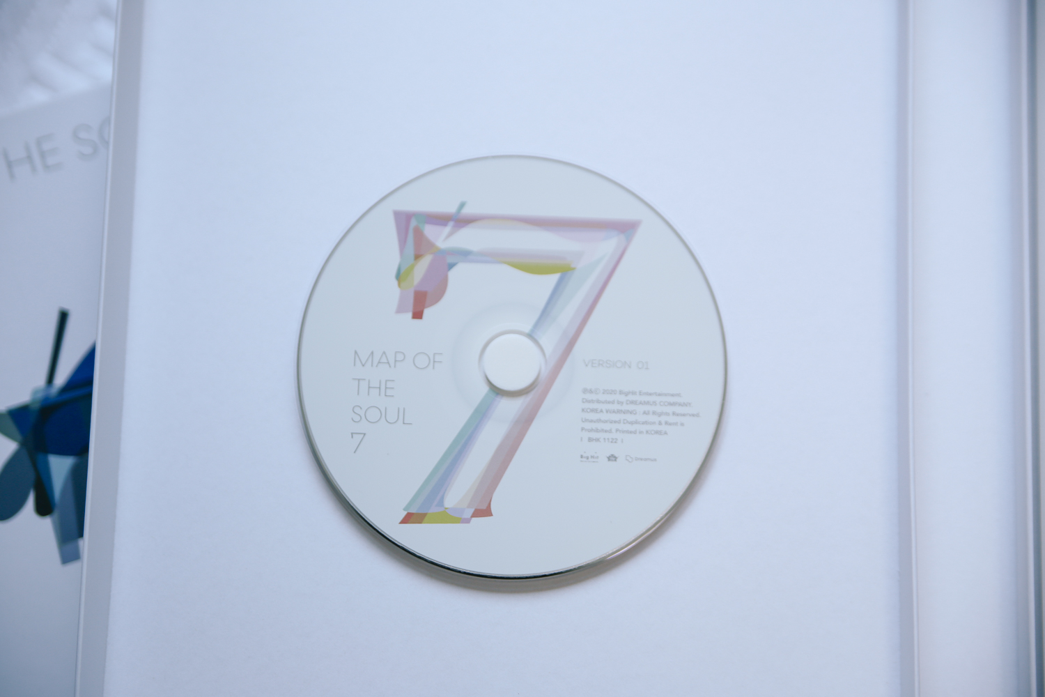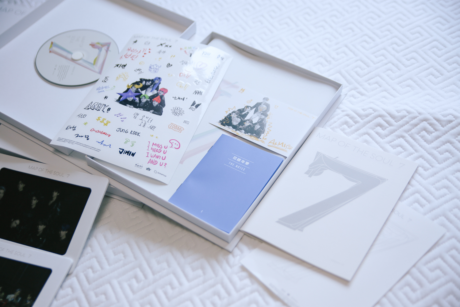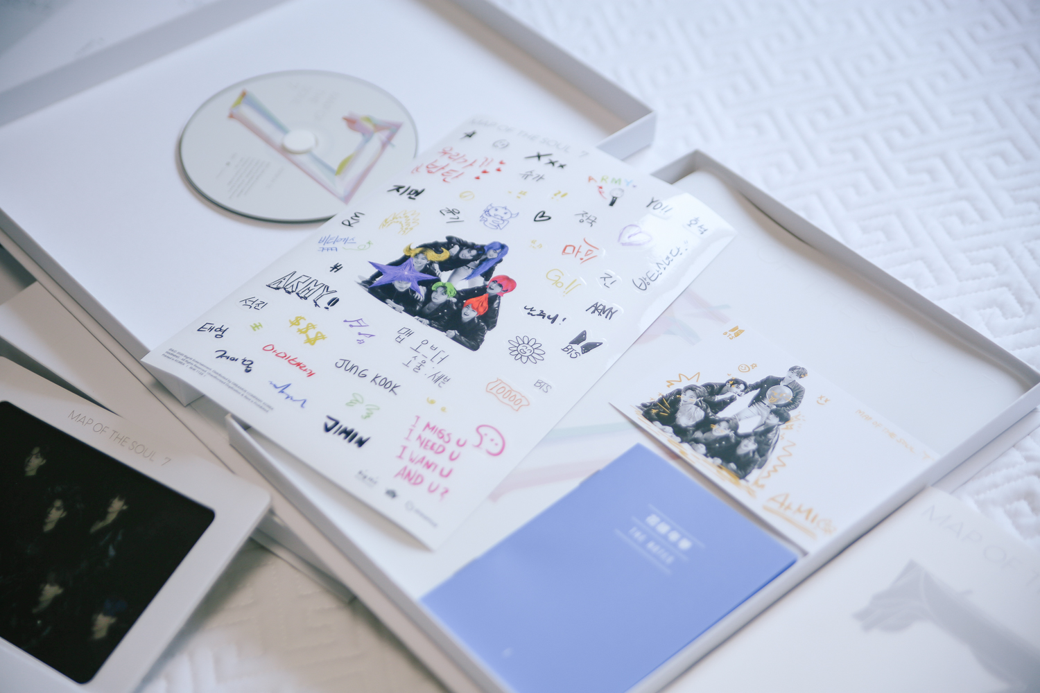 아내가 구매한 방탄 맵 오브 더 소울 7. 각 앨범 버전별로 존재한다. 개인적으로 맨 우측 두 개 1, 4 버전이 제일 예뻤다. 앨범 안에는 방탄이 직접 쓴 글씨로 만든 스티커와 노트, 포토카드(랜덤), CD, 책자 등이 있다.