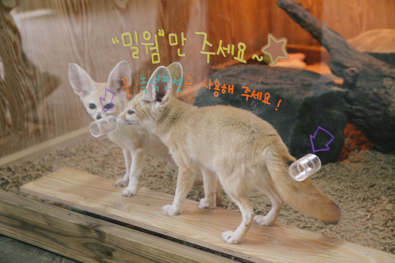 귀여운 사막여우는 배가 고픈지 자꾸 먹이를 주는 파이프에 입을 대는 모습이다. 미안해 ㅠㅠ 먹이를 못 샀어.. 힝