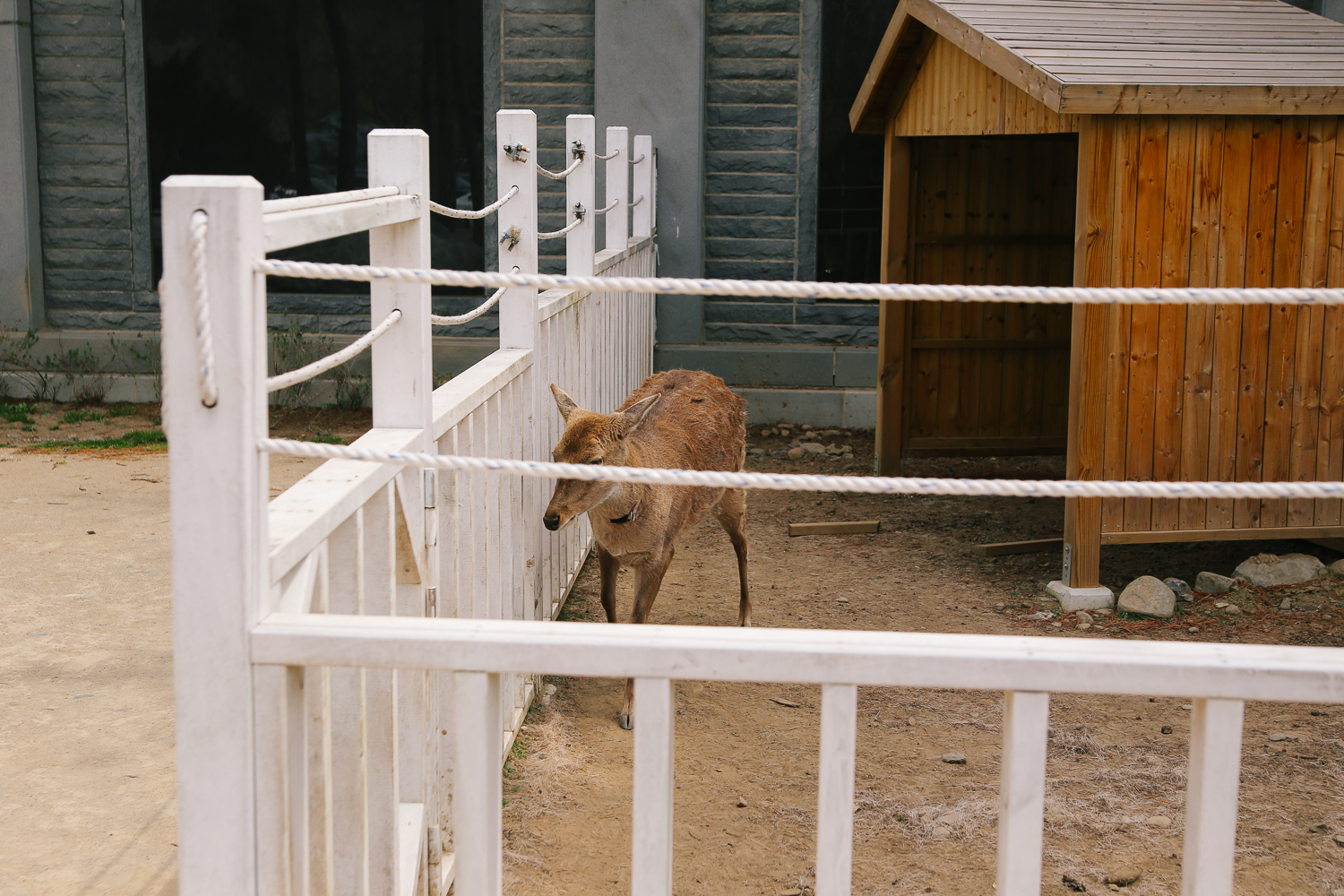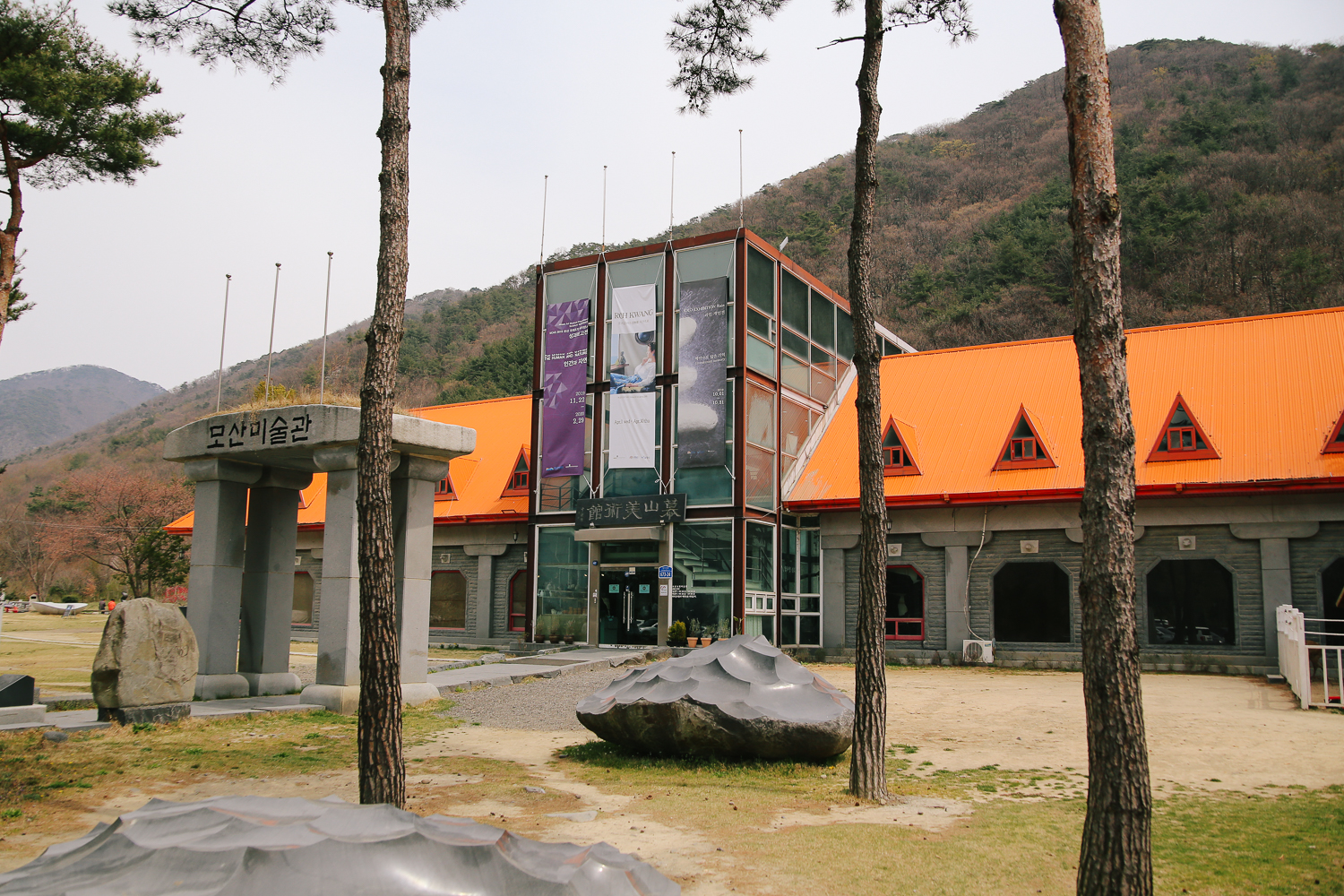 바둑이네 동물원 구경을 마치고 바로 옆에 위치한 모산 조형 미술관에 방문하였다. 주황색 지붕이 눈에 띄는 곳이다. 예전에 통로 쪽에 목줄을 하고 있던 사슴은 우측에 넓은 울타리에 집을 지어줘 편하게 휴식을 취하고 있었다.