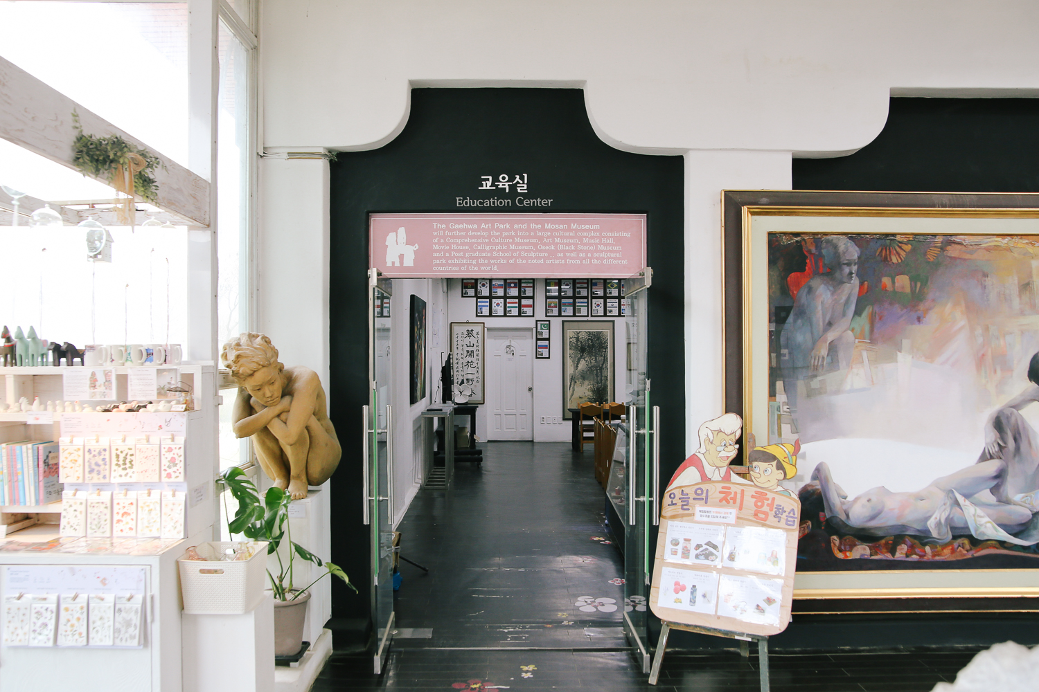 모산 조형 미술관에 들어서면 기념품과 미술관, 체험을 할 수 있는 공간이 있다. 원래 2층에도 전시작품들이 있는데 코로나 여파 때문에 전시를 축소했는데 2층의 경로를 막아놓은 상태였다. 아쉬운데로 1층에 위치한 미술관을 들어갔다.