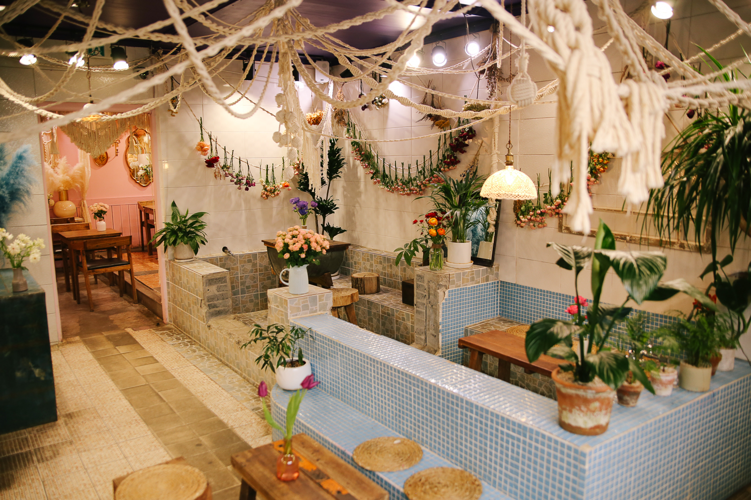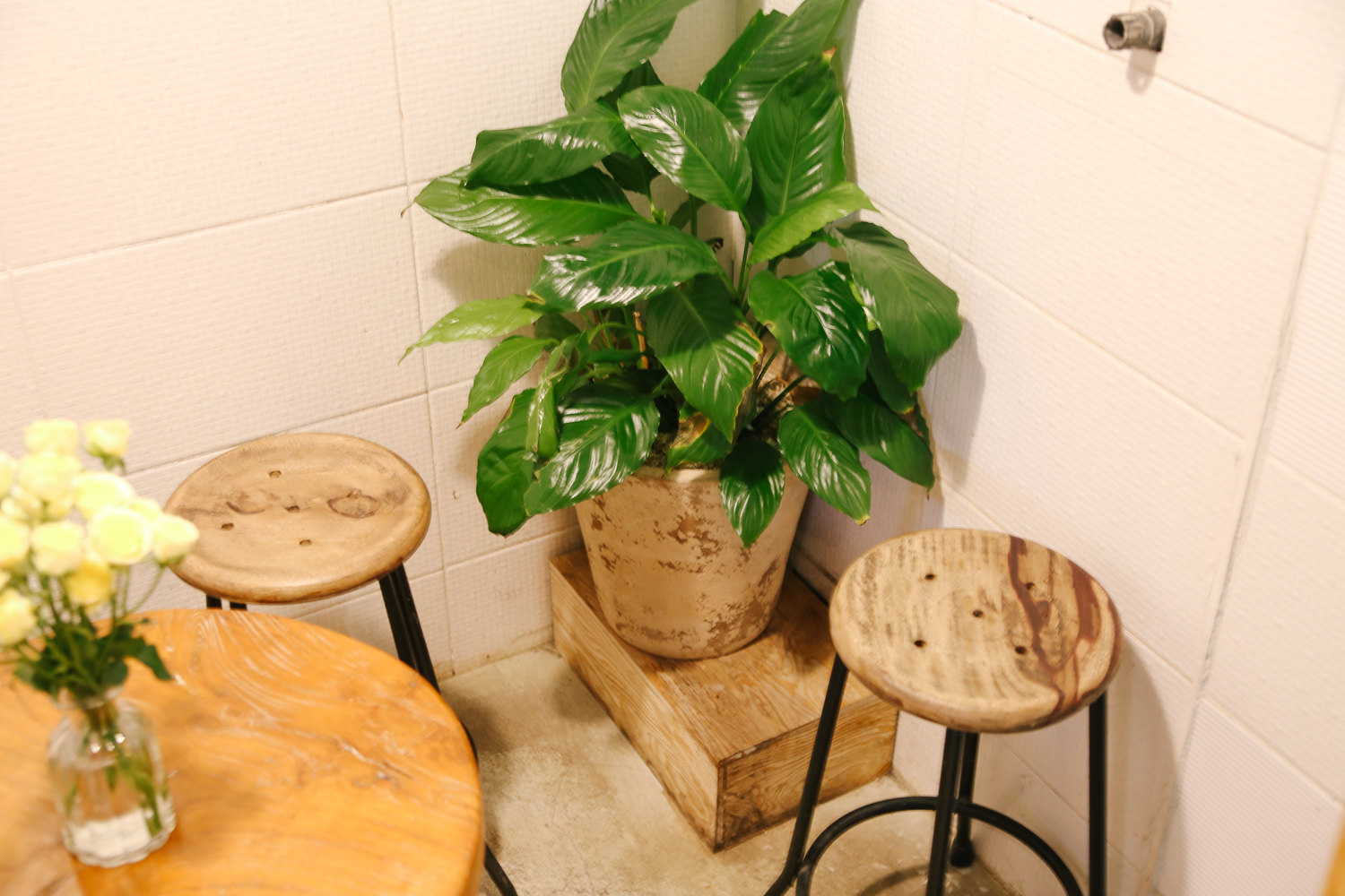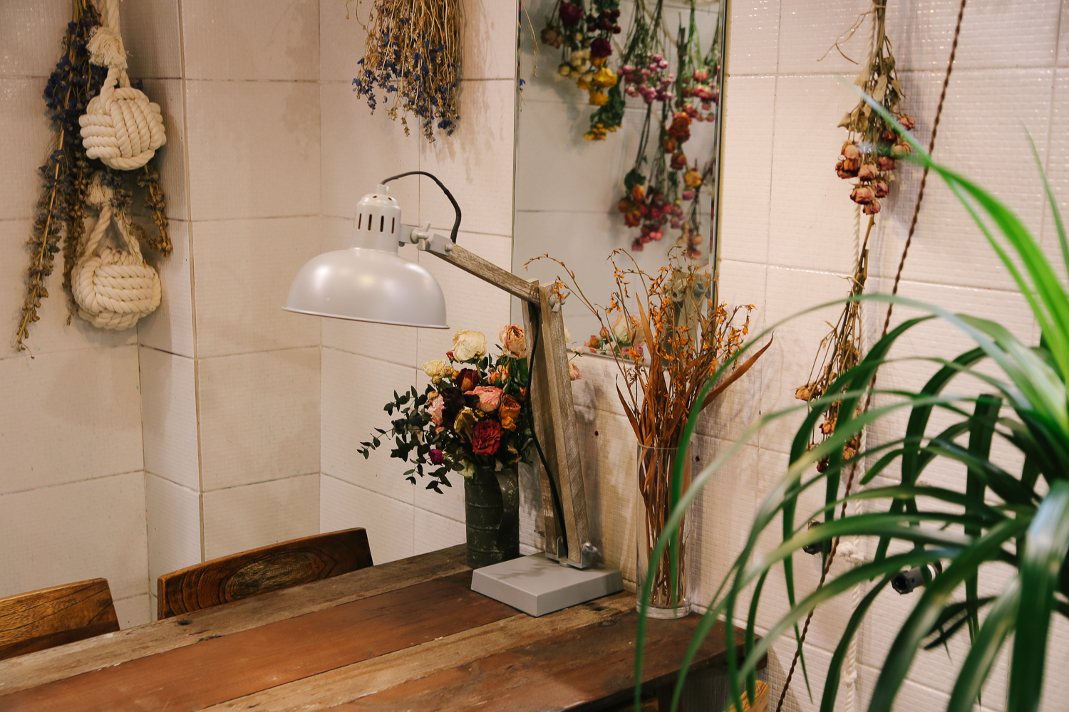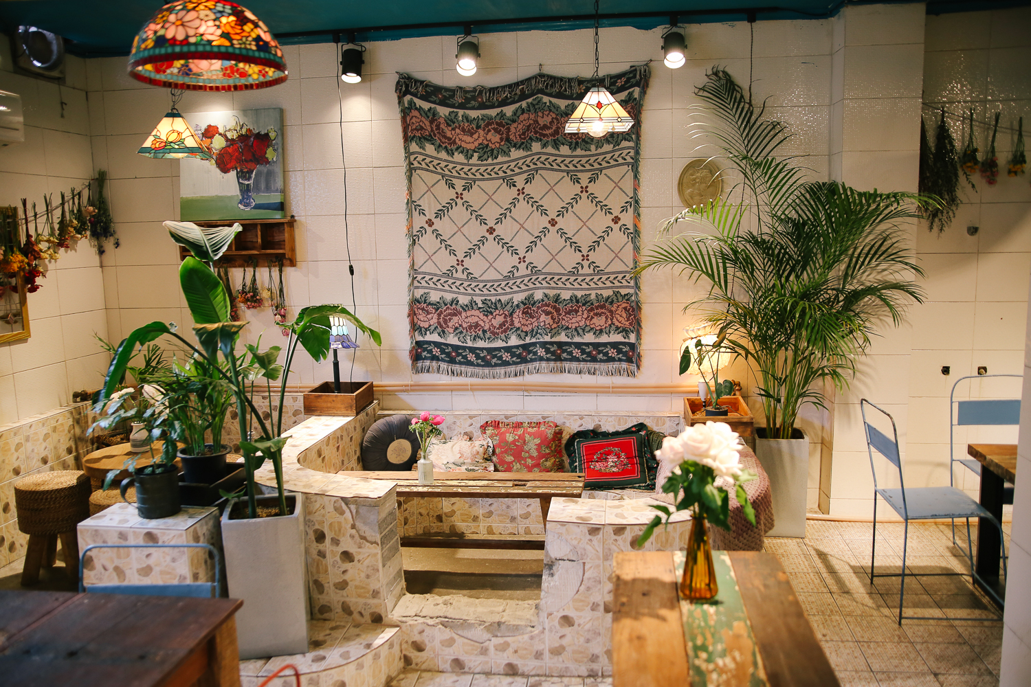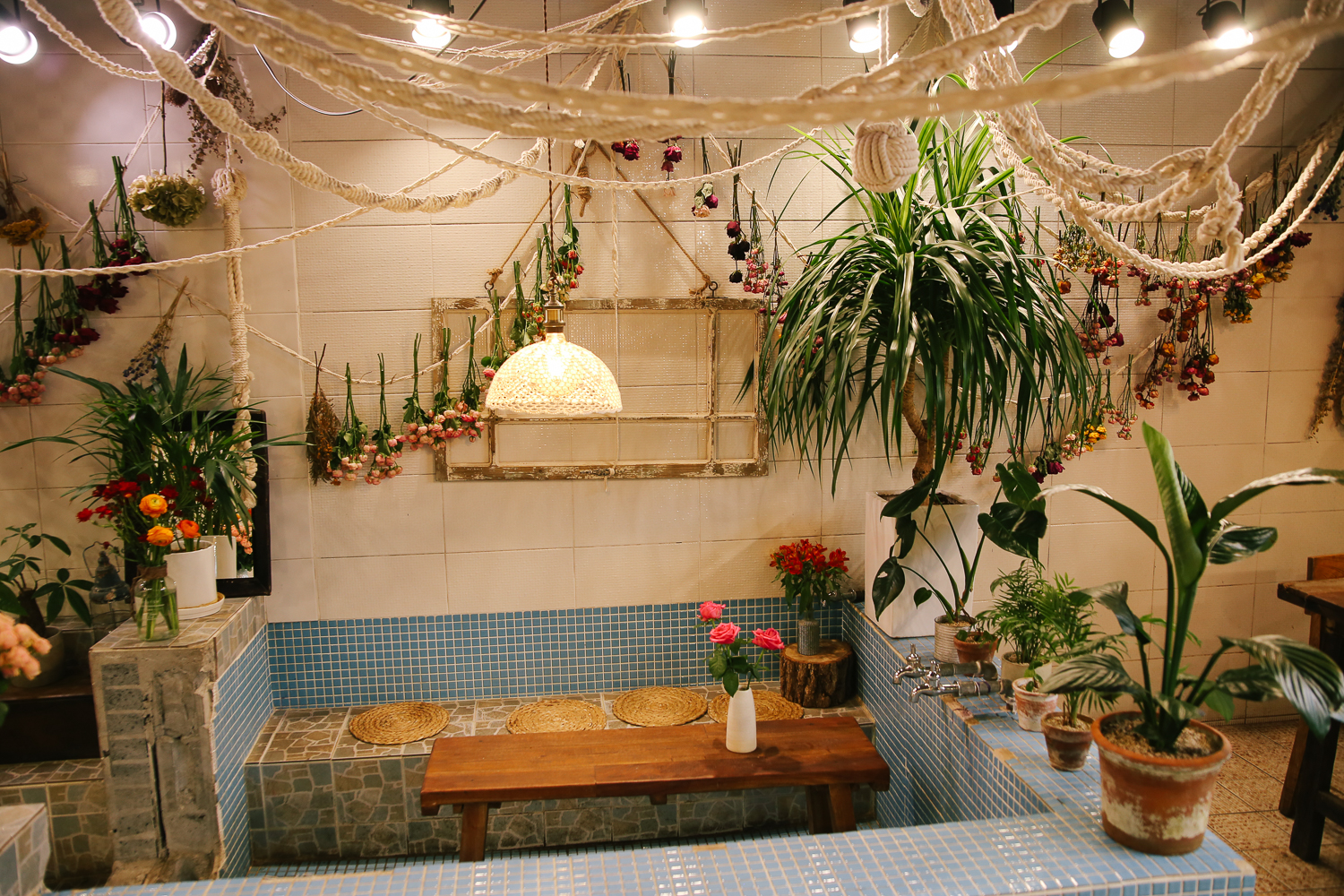 안쪽으로 더 들어가면 마치 목욕탕 같았던 공간을 예쁘게 꾸며놓은 모습이다. 다양한 식물의 플렌 테리어. 다양한 감성의 조명. 원목 테이블들도 있고, 화분이 많아서인지 빈티지함이 세련되게 느껴졌다.
