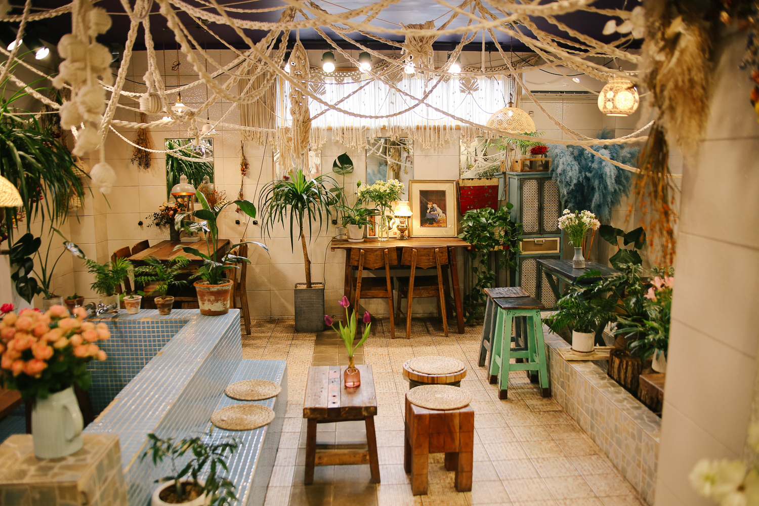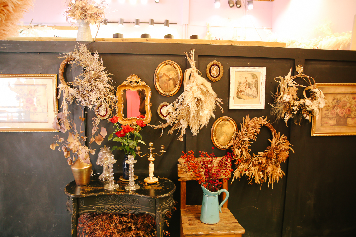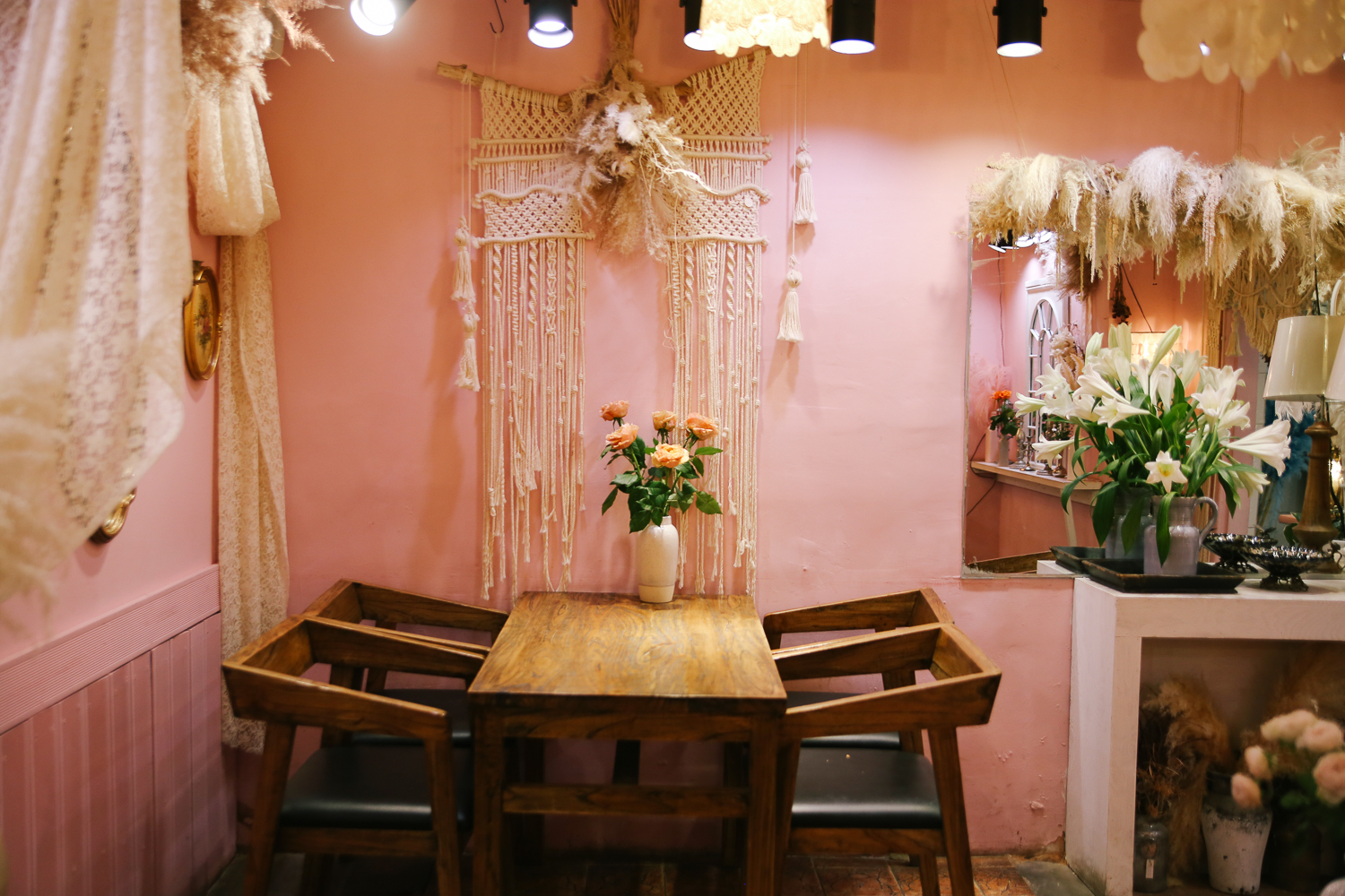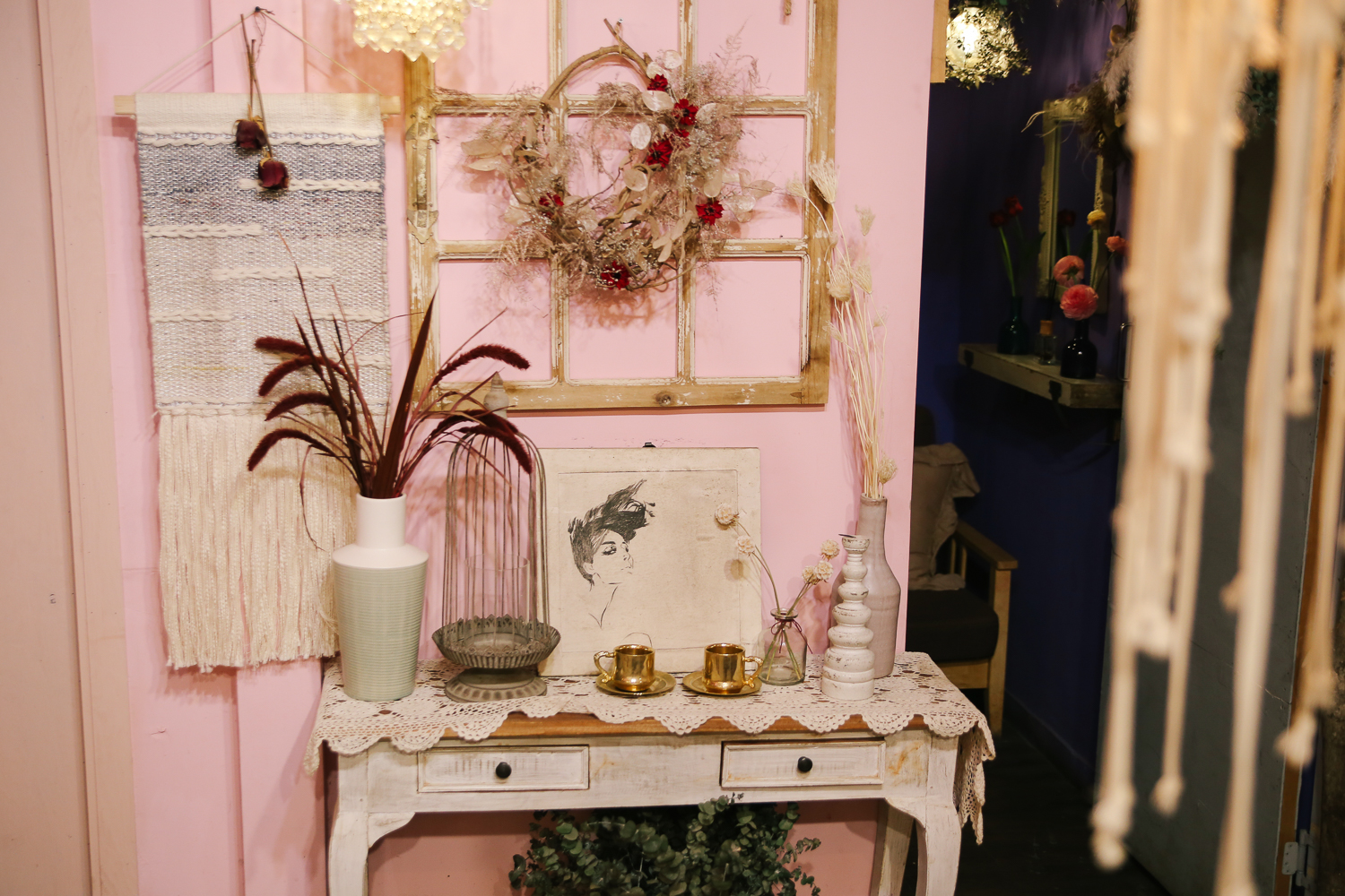 따란! 이곳은 다른 공간에 잘 꾸며진 테이블이었다. 파스텔 톤의 분홍색 벽에 새하얀 꽃들이 있었다. 다양한 꽃과 인테리어 소품, 마크라메 월행잉도 있었다. 크.. 그냥 눈으로 보기만 해도 예쁜 모습 :)