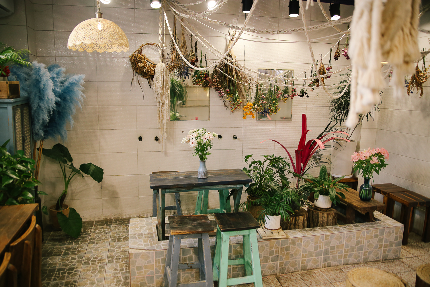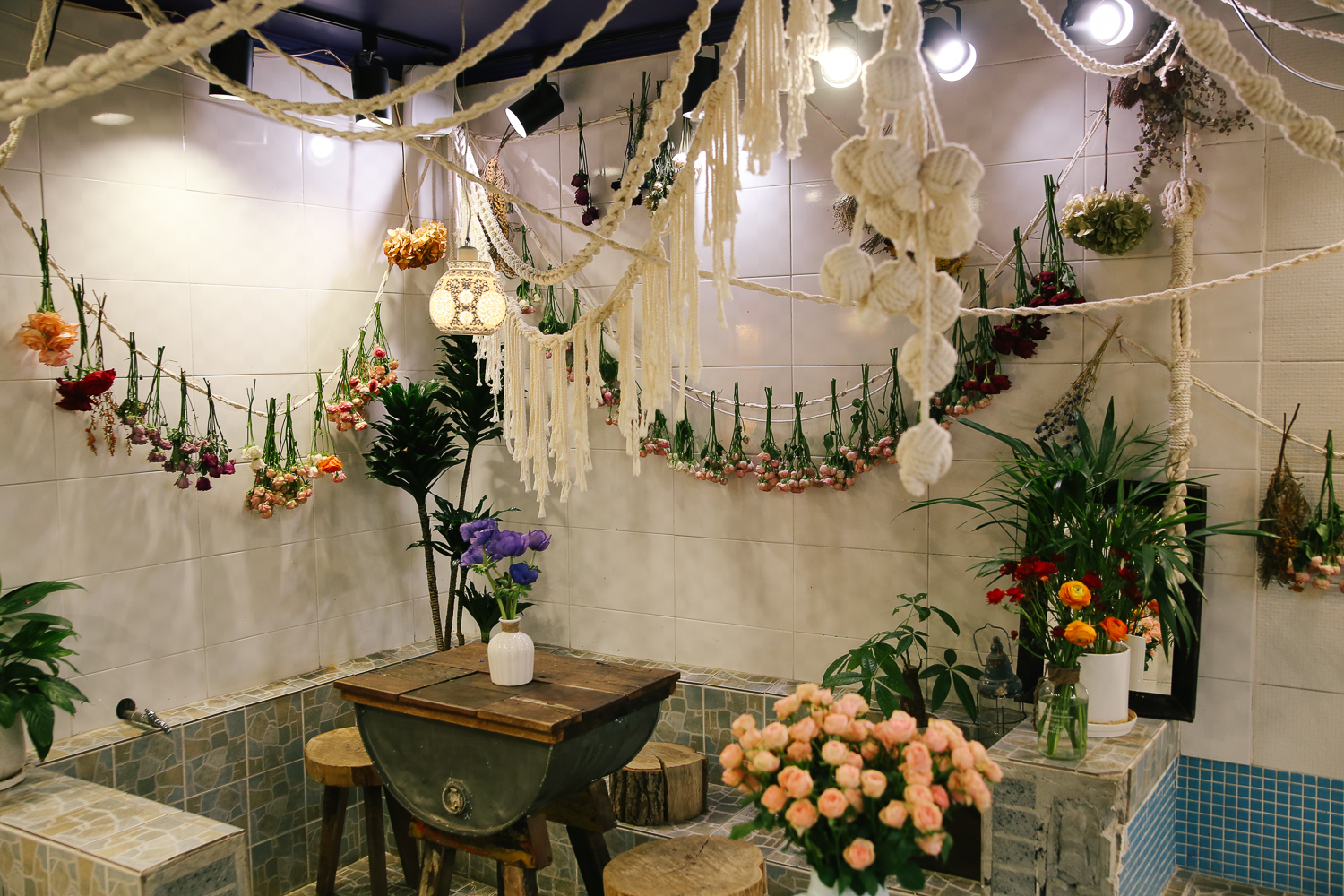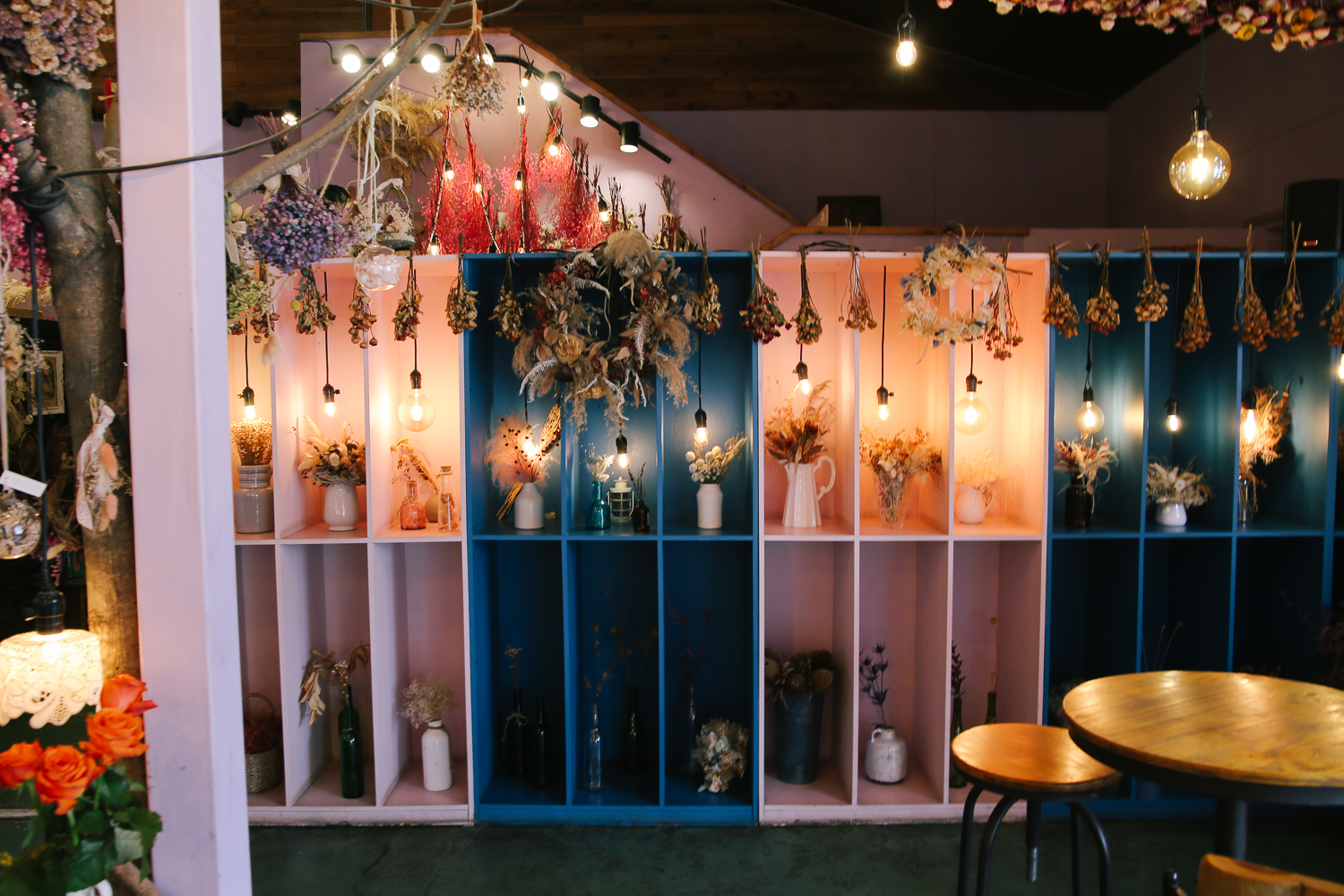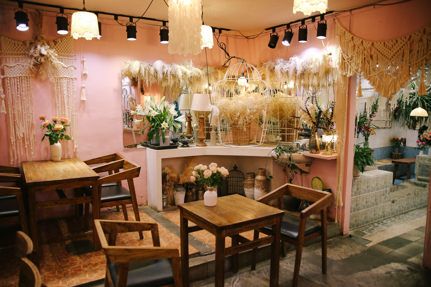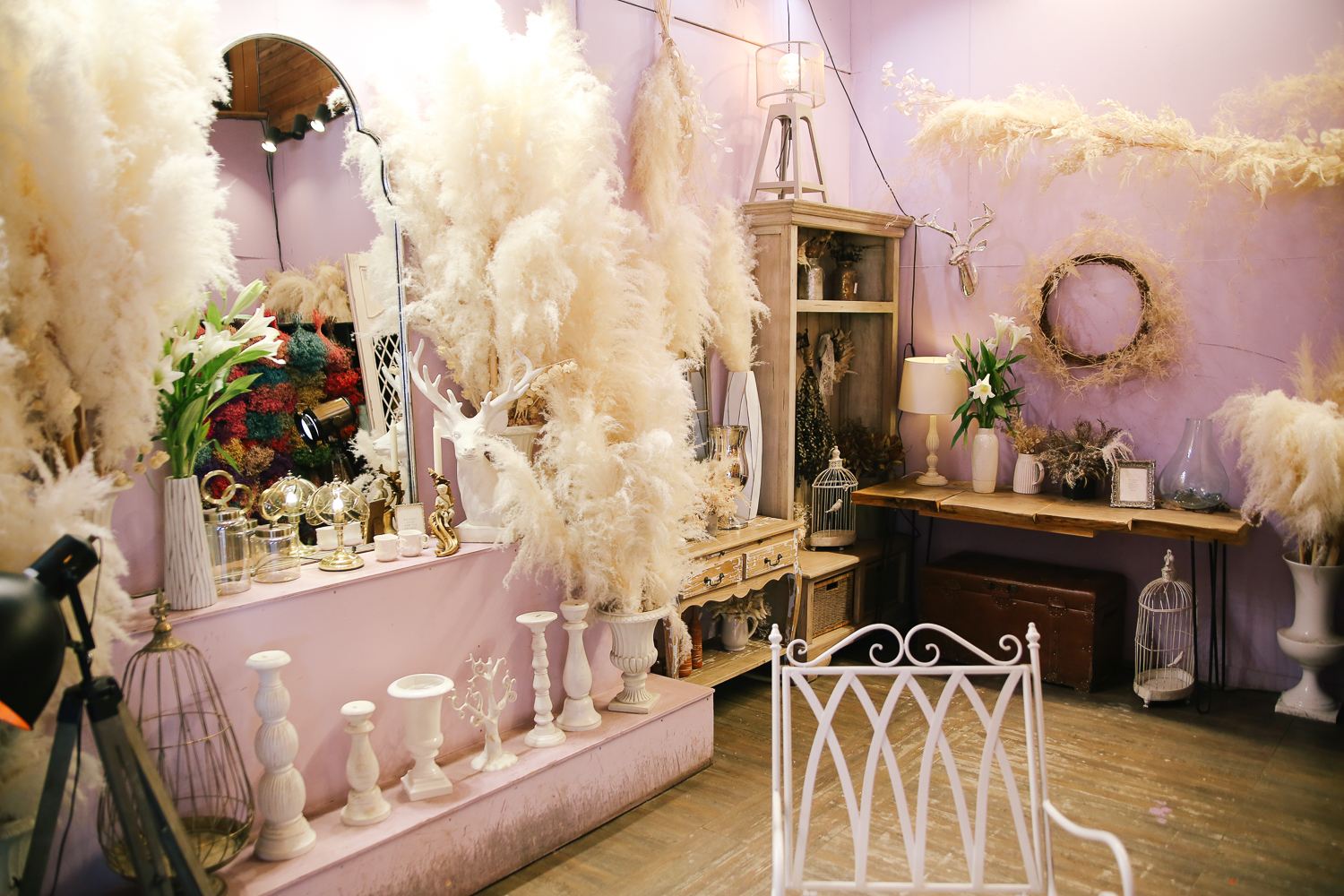 따란! 이곳은 다른 공간에 잘 꾸며진 테이블이었다. 파스텔 톤의 분홍색 벽에 새하얀 꽃들이 있었다. 다양한 꽃과 인테리어 소품, 마크라메 월행잉도 있었다. 크.. 그냥 눈으로 보기만 해도 예쁜 모습 :)