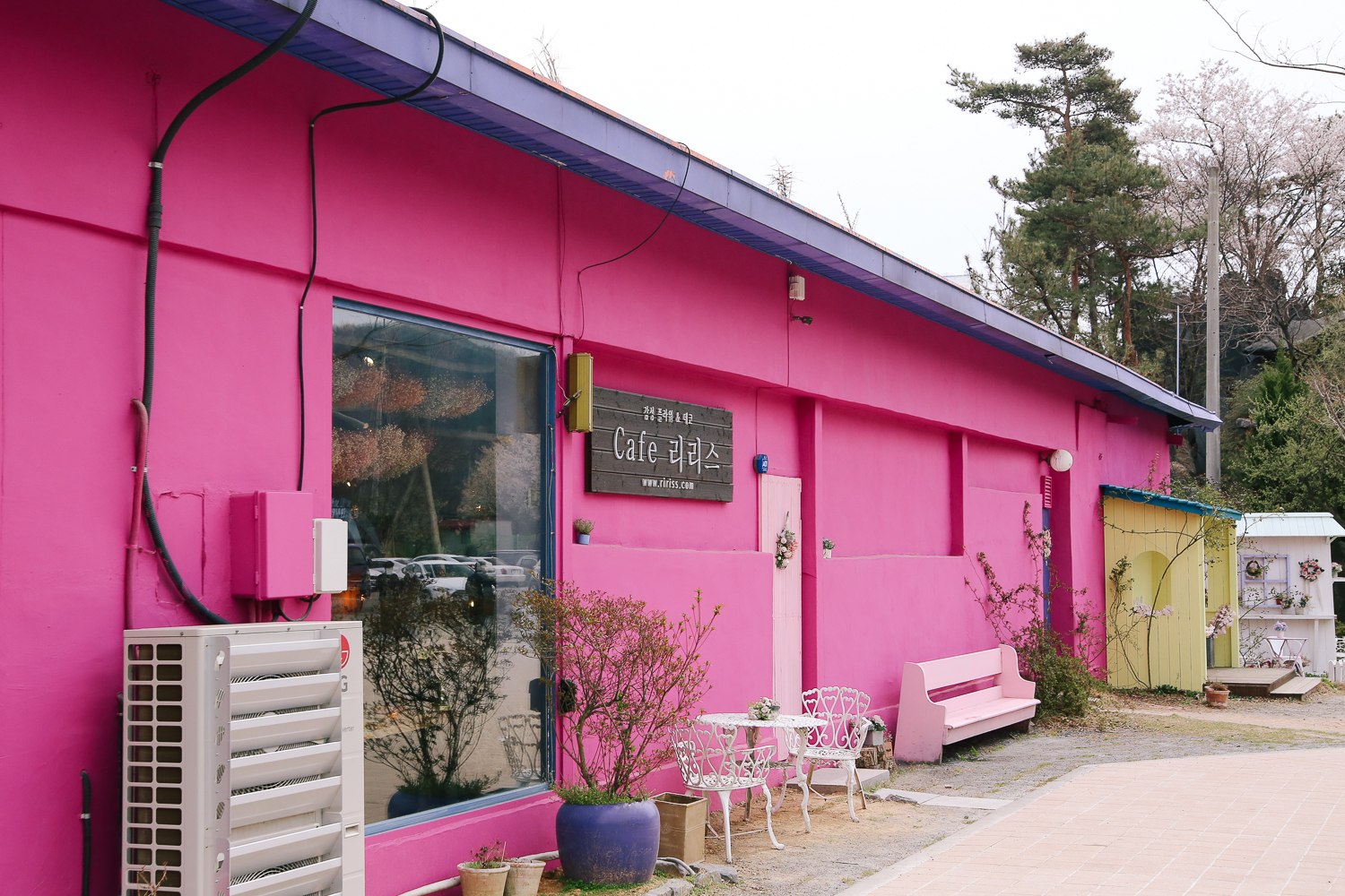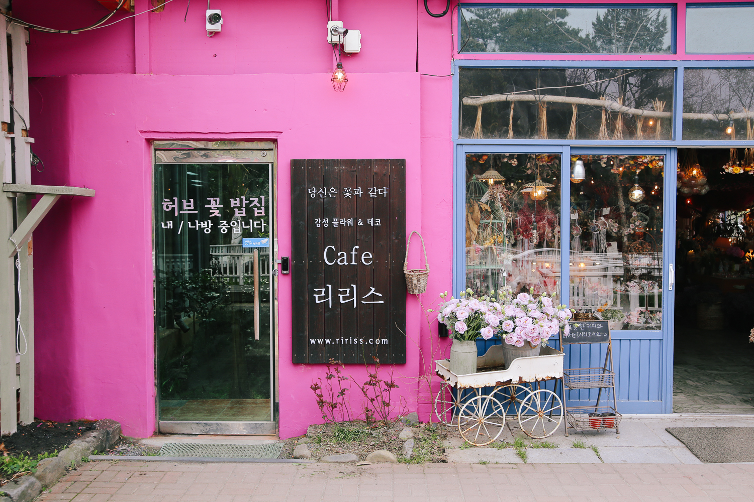 허브랜드를 지나서 꽃집과 기념품 가게를 나오면 넓은 정원이 나온다. 그곳에 위치한 핑크색의 예쁜 건물이 바로 감성카페 리리스이다.