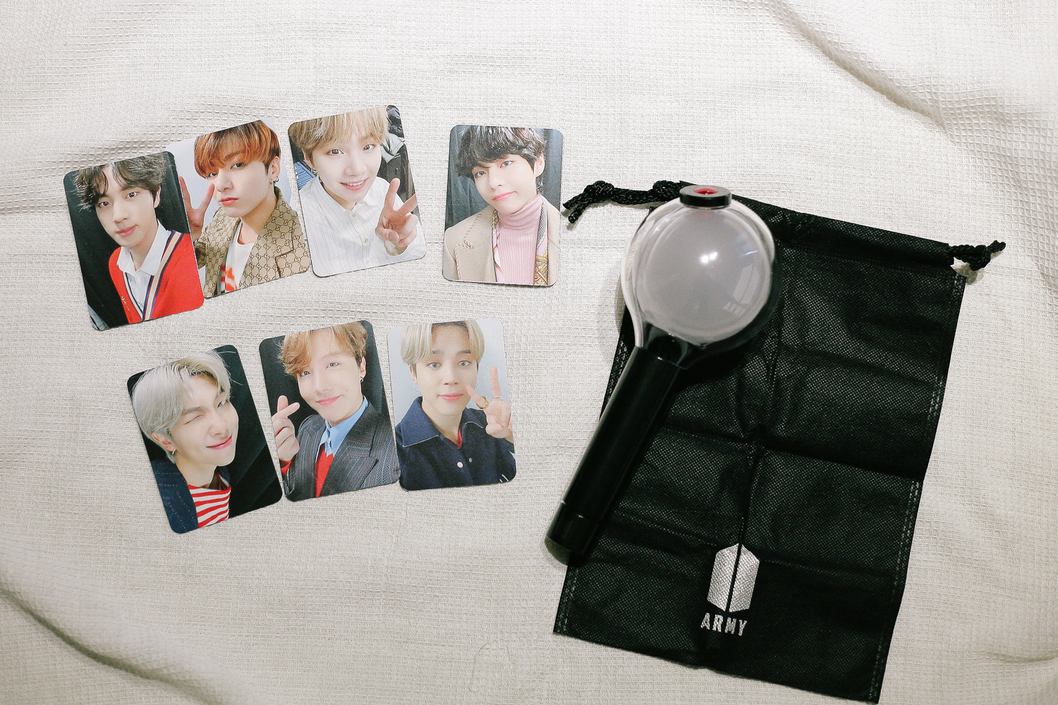 패키지를 개봉하면 방탄소년단의 사진 카드가 있고, 아미봉 주머니, 아미봉, 아미봉 고리도 있었다.