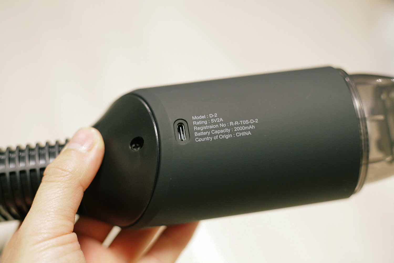 여기는 바닥면인데, 이곳 중앙에서 미니 청소기 작동을 하면 흡입하고 필터를 거치고 나오는 바람이 뿜어져 나온다. 이곳에 불어내기 연장 노즐을 연결하여 에어를 쏠 수가 있다. 그 세기는 굉장히 강하지 않지만 손 선풍기처럼 적당한 바람이 분다.