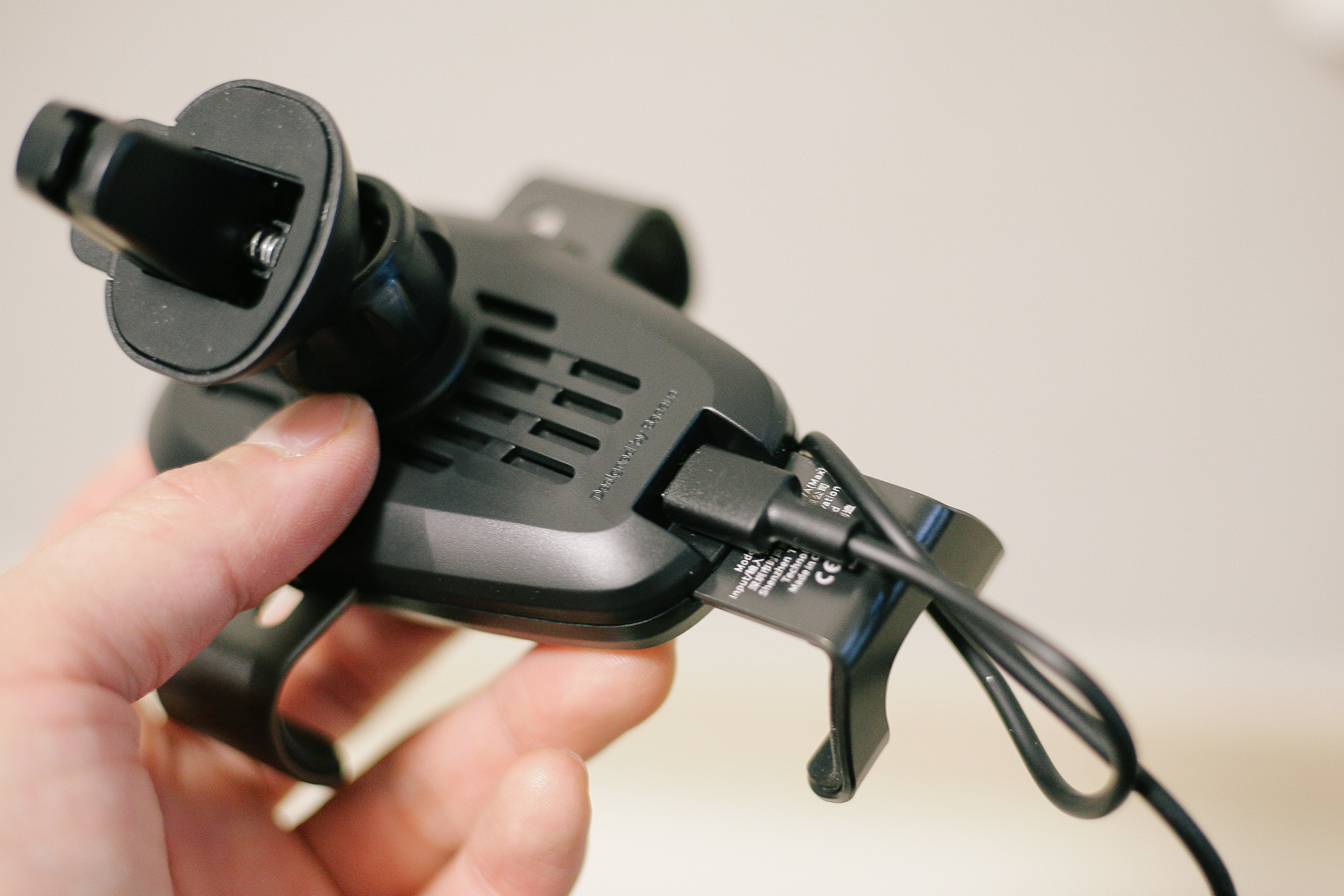 고정핀과 거치대, 그리고 USB 포트 선이 있다. 일단 거치대 안쪽에 선을 연결하면 휴대폰을 거치만 해도 무선으로 충전이 되는 형식이다.