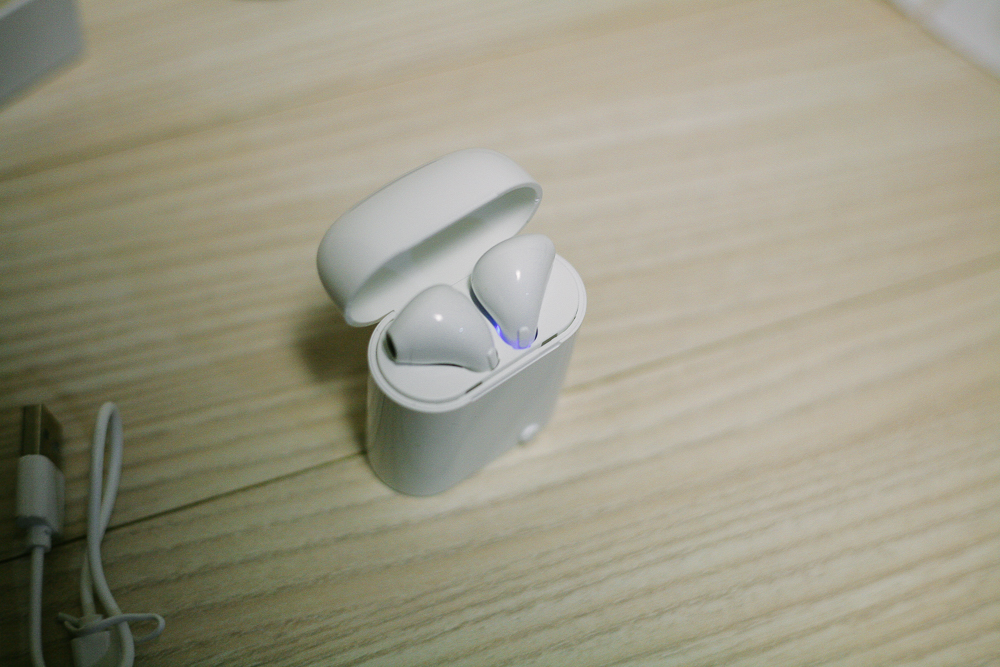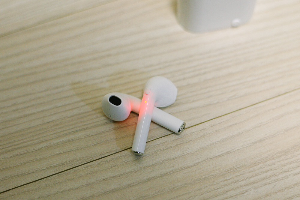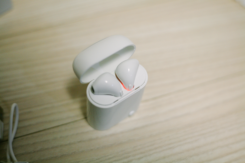 그안에는 블루투스 무선 이어폰 한쌍이 꽂혀있다. 에어팟처럼 휴대케이스에 넣어놓으면 충전이 되는 방식은 동일했다. 사진과 같이 붉은, 파란빛이 들어온다면 충전이 되고 있다는 것이다.