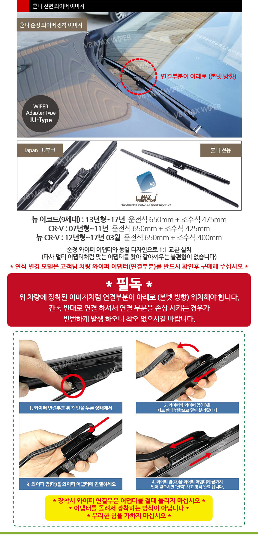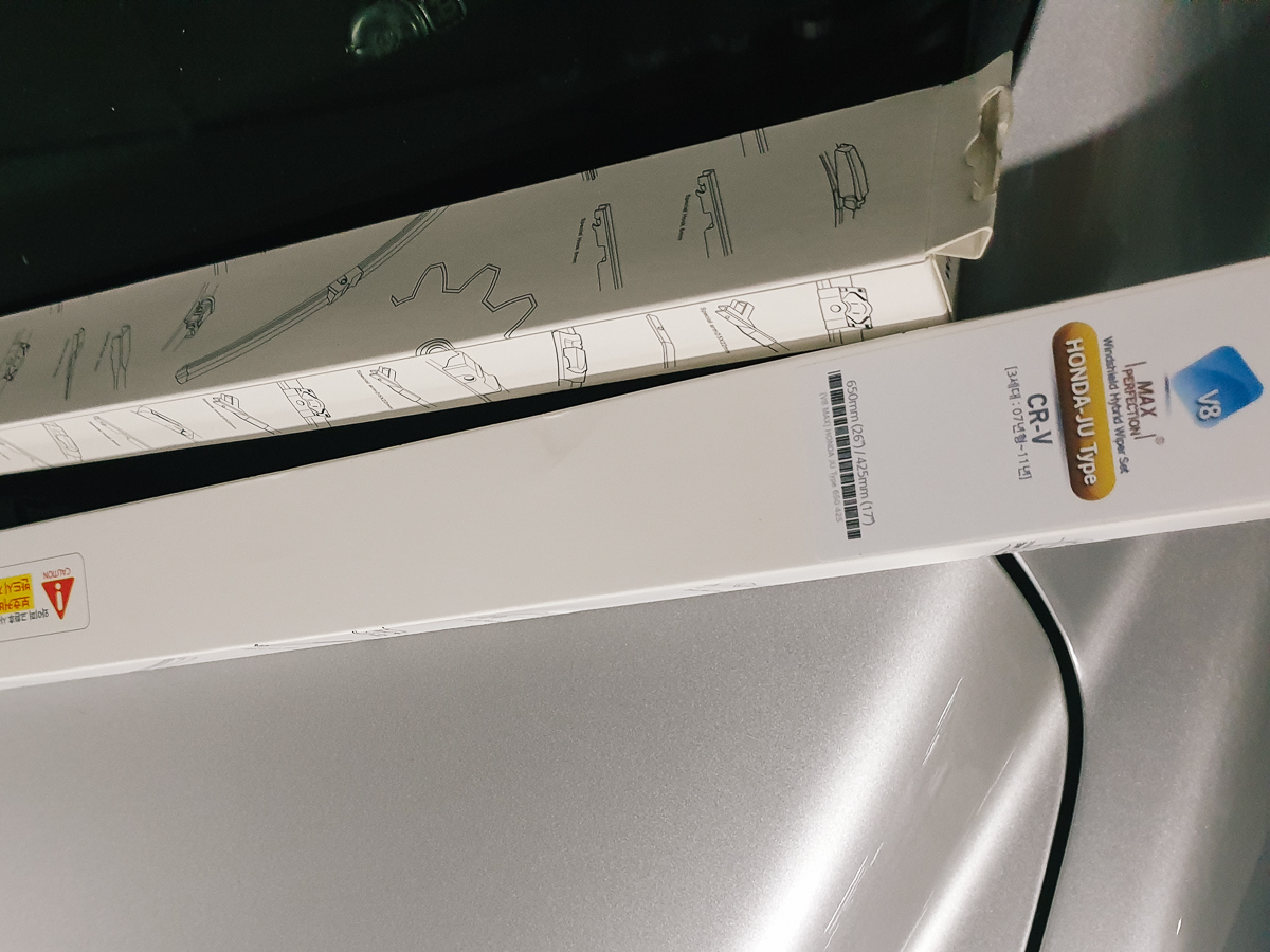 혼다 cr-v 3세대 기준 와이퍼 규격은 650mm, 425mm 이며, 후방은 350mm이다. 연식에 따라서도 상이할 수 있으니 꼭 연식을 확인하고 구매할 것은 권장한다. 귀찮고 저렴한 맛에 호환용 샀다가 나처럼 낭패를 볼지도 ㅠㅠ