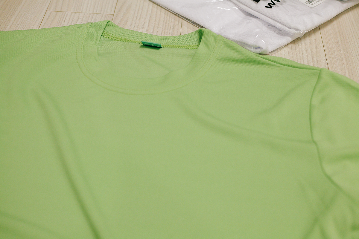 먼저 내가 사고 싶었던 연두색 티셔츠. 상세에 보여진 형광색 컬러와는 달리 약간 채도가 떨어진 연둣빛이 도는 색상이다. 그게 조금 아쉽지만, 뭐 멋 내려고 산거 아니고 운동할 때 입으려고 산 거니..ㅎㅎ 그래도 주문한 것 중 밝은 색이라 마음에 든다.