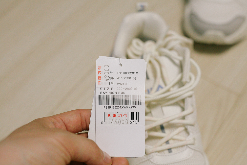 오프라인 매장에서 구매하고 집에 와서 품번을 쳐보니 온라인에도 동일한 가격으로 판매하였다. 온라인 보다 가격이 비쌀 줄 알았는데 완전 개이득 ㅎㅎ 중요한 건,, 아내가 너무 예뻐서 구매한 지 한 달이 다 되어 가는데 신지 않는다는 것이다... 하하하... 웃픈 현실.. 너무 예쁘고 러블리한 휠라 레이 하이 런 FS1 RIB3231X WPK 스니커즈이다.