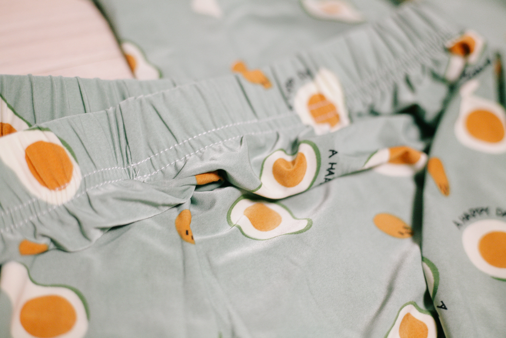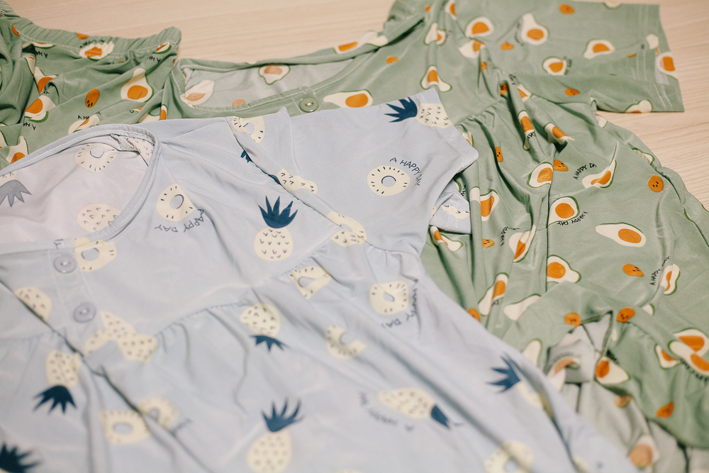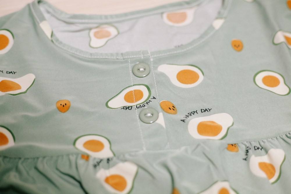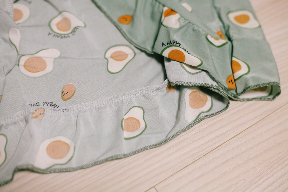 민트색에 계란 노른자가 그려져 있는 귀여운 잠옷. 손매, 상의 끝자락 등 레이스 처리가 되어 있어서 더 편안해 보이는 느낌을 준다. 이 잠옷 역시 보들보들, 시원시원한 원단 :)