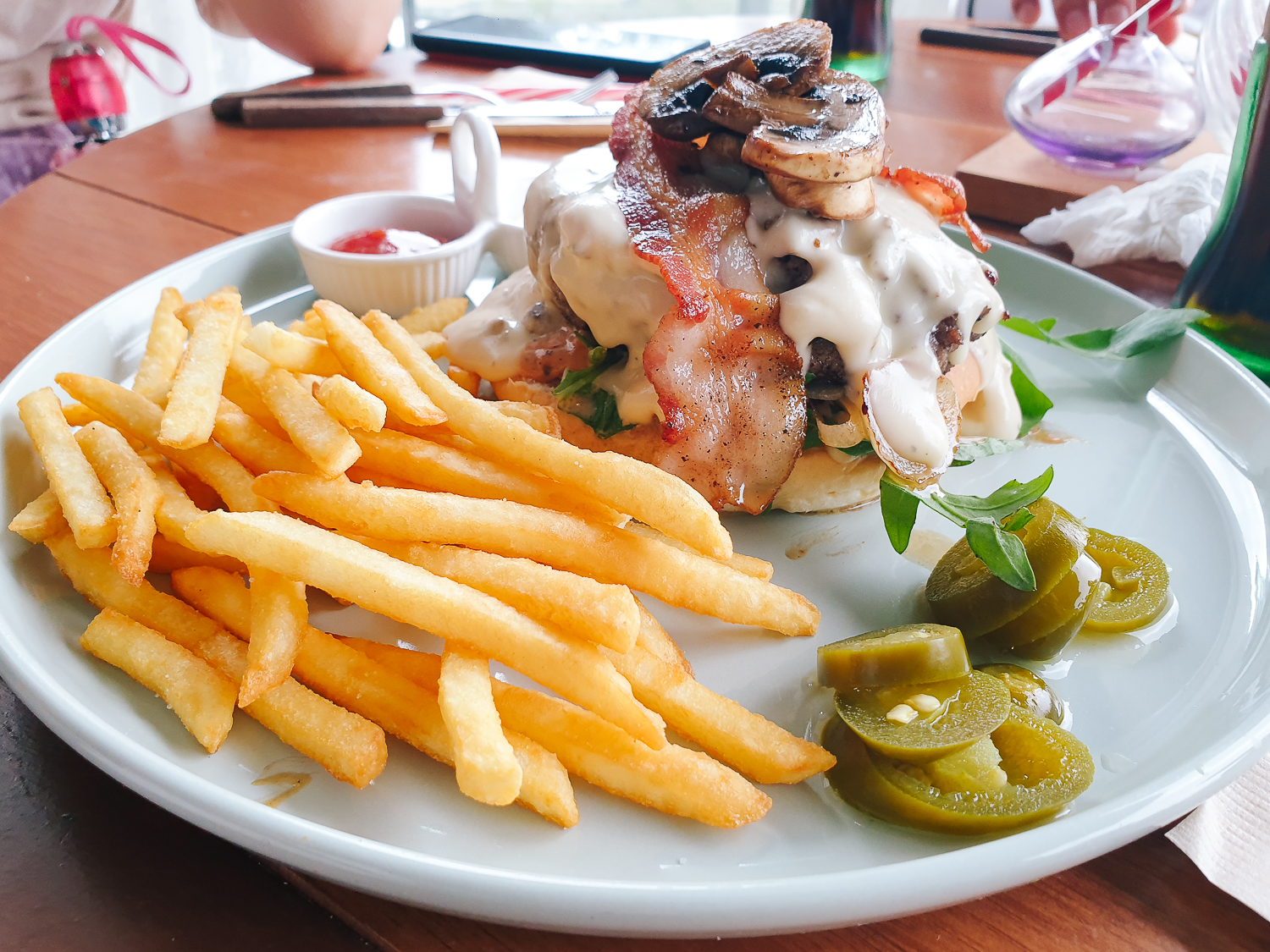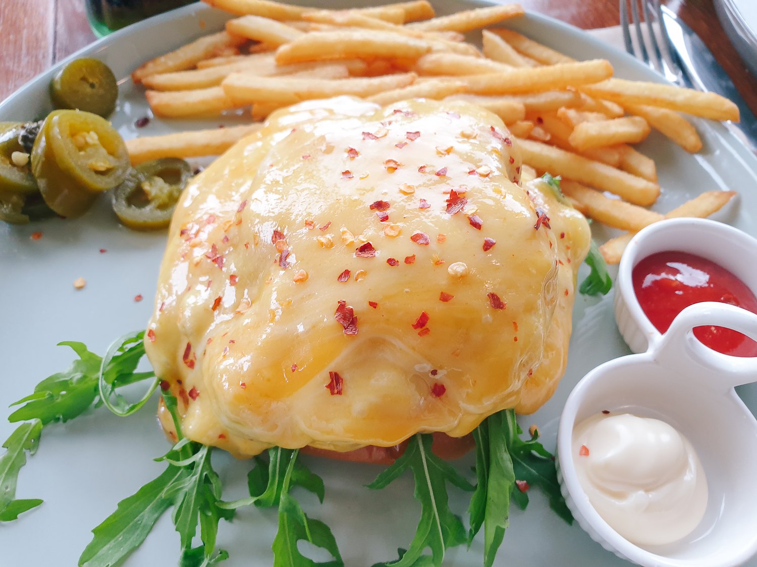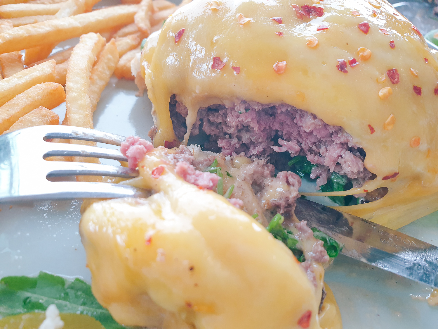 20분 남짓 흘렀을까, 하나둘씩 버거들이 올라왔다. 특히한 점이 햄버거 빵 사이에 패티, 야채, 양념들이 든 일반적인 햄버거가 아닌, 빵이 아래 깔려있고, 그 위에 패티와 야채, 양념이 올려져 있는 형태의 버거이다. 내가 주문한 트리플 치즈버거가 나왔다. 으하하핫; 빵 위를 소복이 덮은 치즈 덩어리. 비주얼 깡패였다 :)