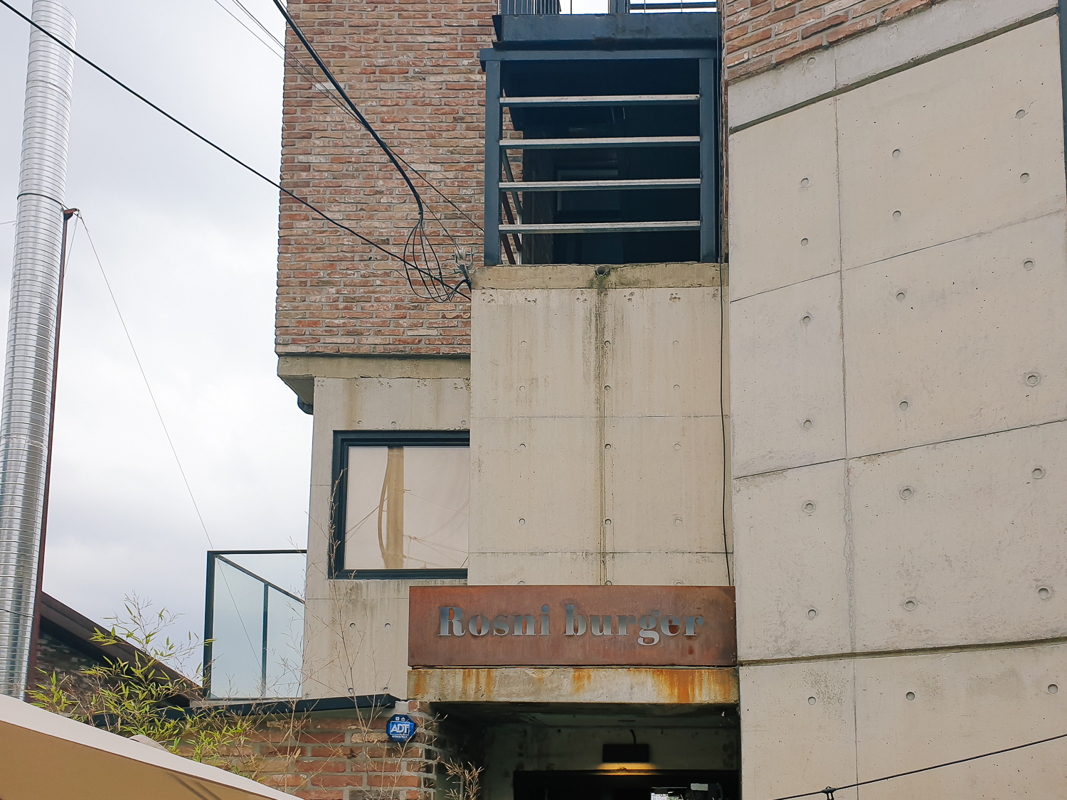 로스니 버거 내부는 전체적으로 요즘 가장 트렌트 느낌의 인테리어로 되어 있었다. 노출 천장, 노출 벽, 레일 조명 전구, 통유리로 된 인테리어. 1층은 주방과 계산대가 바로 보이는 형태로 있었다.