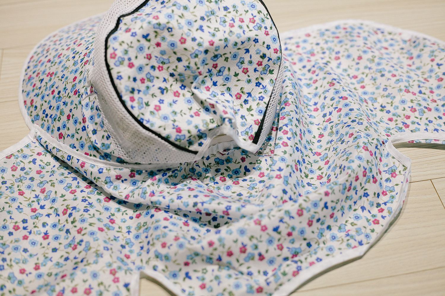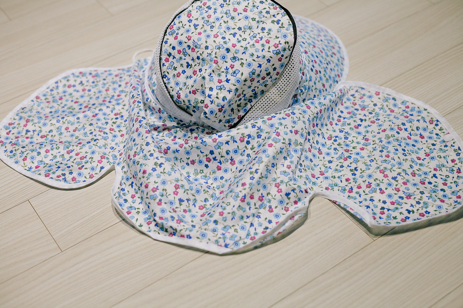 먼저 꽃무늬 농사모자. 여성용으로 남성용 정글 모자보다 더 햇빛을 효율적으로 가릴 수 있어 보였다..ㅎㅎ 패턴은 저런 꽃무늬이고, 색상은 선택 불가. 판매자 임의대로 랜덤으로 발송된다. 머리 둘레 부분은 매쉬 원단으로 제작되어 통기성이 우수하여 무더운 여름날 땀을 조금이라도 식혀주는데 도움을 준다.