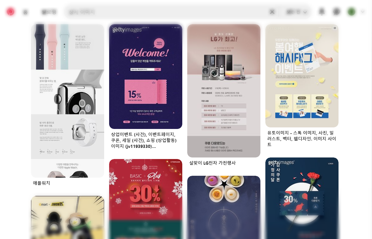 상단 링크를 접속하고, 본인이 작업하고자 하는 키워드를 입력해본다. 예. 상세 디자인. 상세 이미지 검색을 하게 되면 검색어에 알맞은 이미지들이 리스트업 된다. 예시를 너무 포괄적으로 들었는데, 반값 세일 이벤트를 작업하게 된다면 반값 세일 이벤트를 입력해도 된다. 가장 원하고 유사한 자료를 찾을 수 있지만, 너무 세분화된다면 의외로 자료가 없으니, 적당히 포괄적이게 입력하는 게 좋다. 또한, 한글 외 영어로 입력해도 더 다양한 자료가 나올 수 있으니 적당히 병행하면서 검색해보면 좋다.