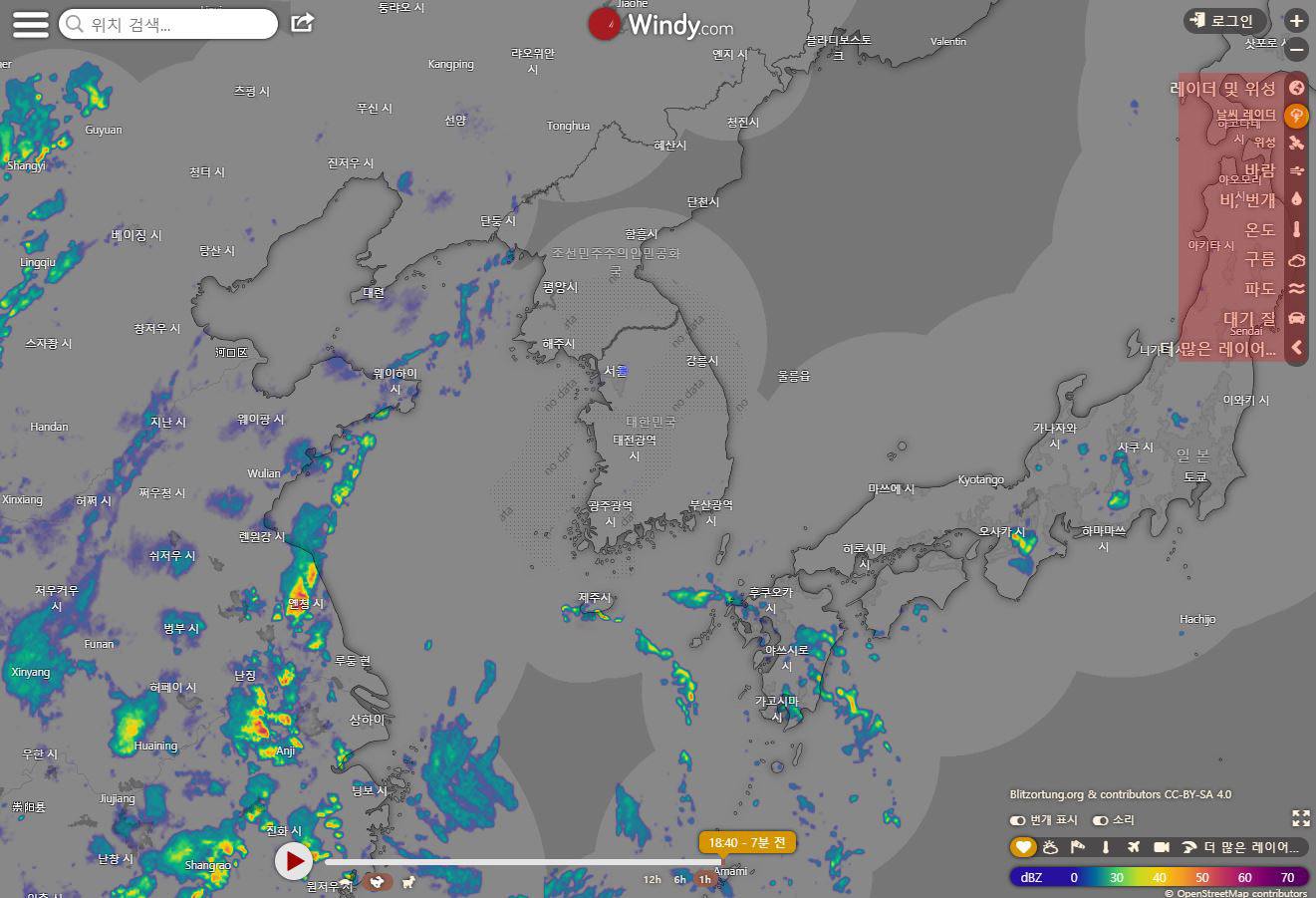 상단 링크를 클릭하여 접속하면 우리나라 기준으로 되어 있다. 접속을 하면 우측 메뉴에 레이더 및 위성, 바람, 비 번개, 온도, 구름, 대기질, 많은 레이더 등의 다양한 메뉴가 있다.