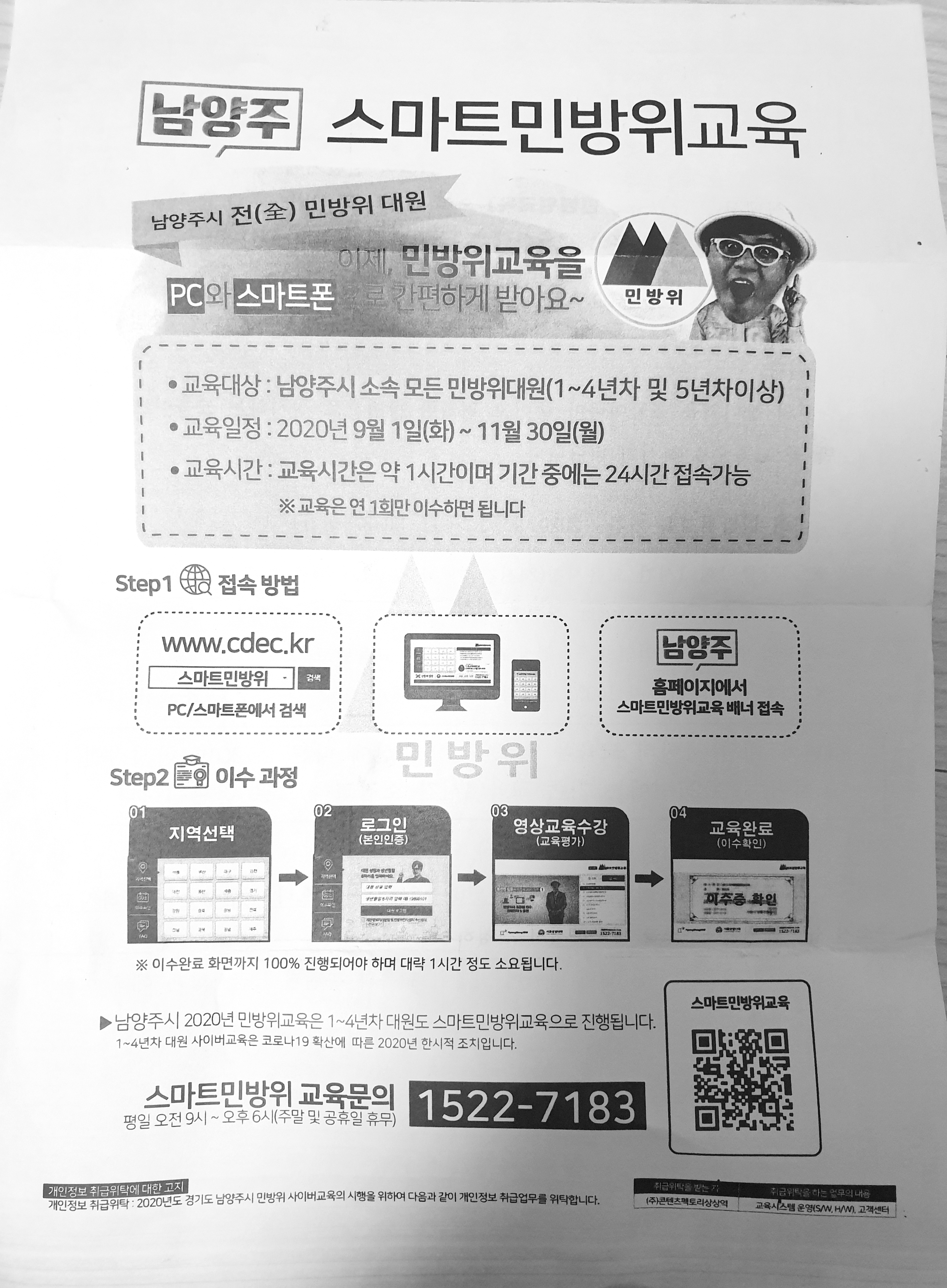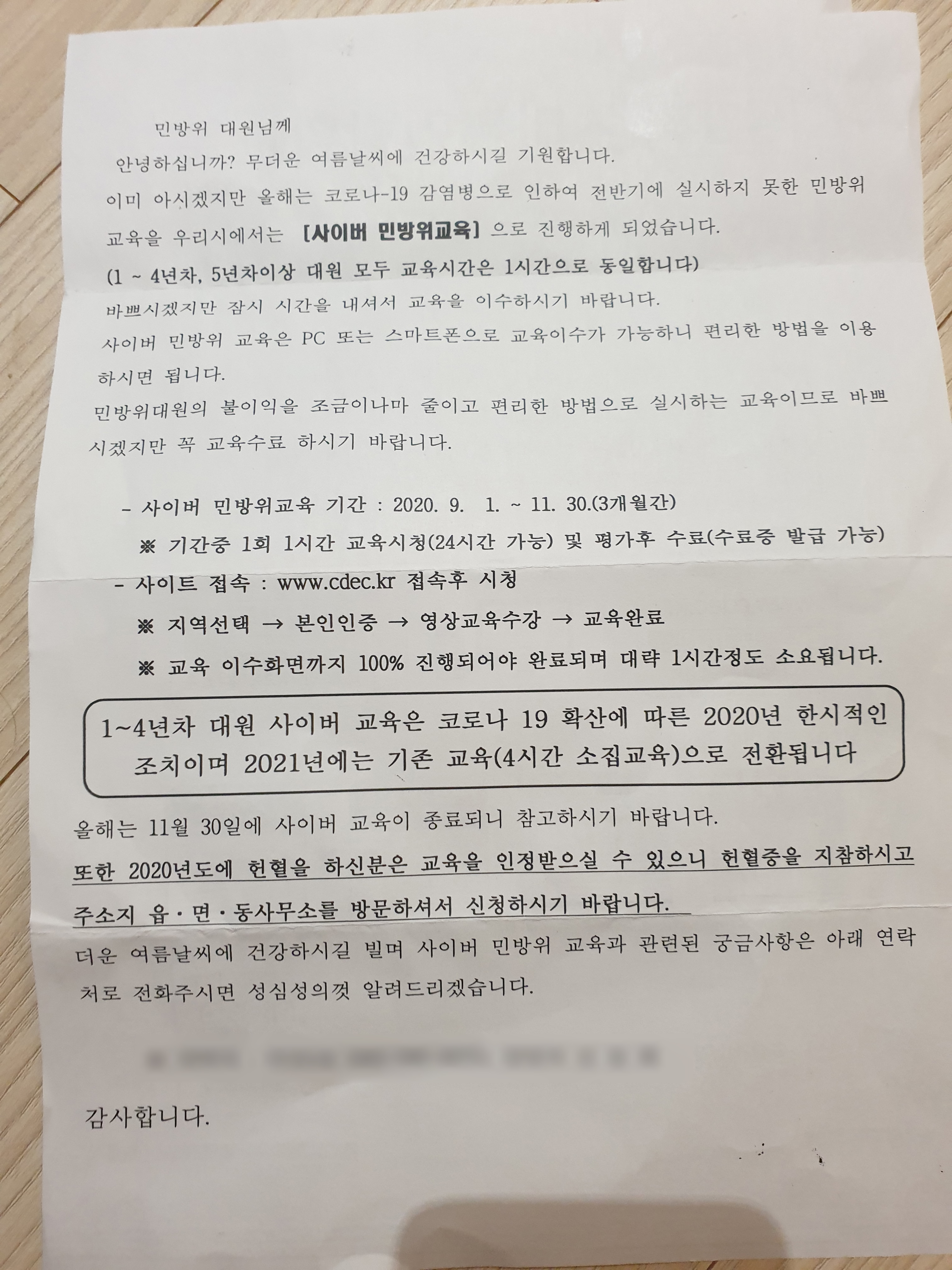 마이삭 태풍이 서서히 몰려올 퇴근길에 집 우편함을 보니, 통지서가 와있었다. 봉투로 온 거라 왠지,, 또 딱지 끊은 건가 싶었지만 다행히도 민방위 교육 안내문이었다. 아무래도 코로나 19 때문에 안전을 위해 민방위도 온라인 교육으로 대체하고 있다는 내용이다.