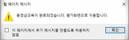 힘겹게 동영상 교육을 완료하면 위와 같이 팝업창이 뜬다. 확인 버튼 후 바로 평가로 들어간다.