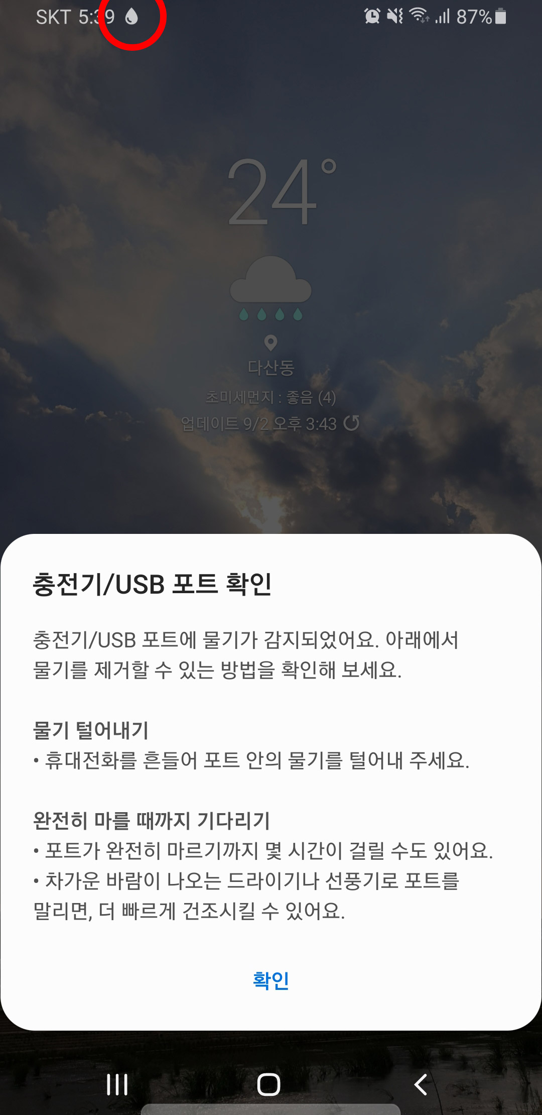 충전기/USB 포트에 물기가 감지되었다며, 물기를 제거할 수 있는 방법을 확인하라는 것! 물론 포트를 건조시킬 방법에 대해서도 기재된 모습이다. 처음에는 조금 지나다 없어지겠지 했는데, 꽤 오랜 시간 지속되었고, 물기가 사라져야 아이콘이 사라질 것 같은 느낌을 받았다.