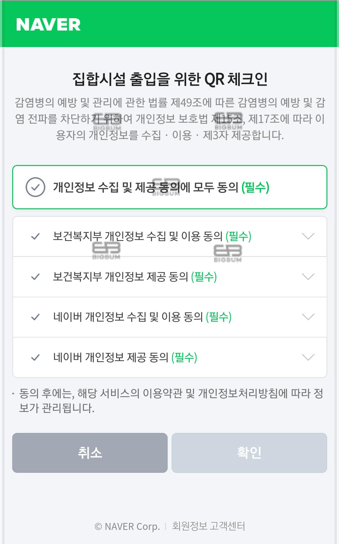 ② 네이버 QR코드 최초사용시 개인정보 동의를 구하는데, 전체 메뉴를 체크 후 확인 버튼을 눌러준다.