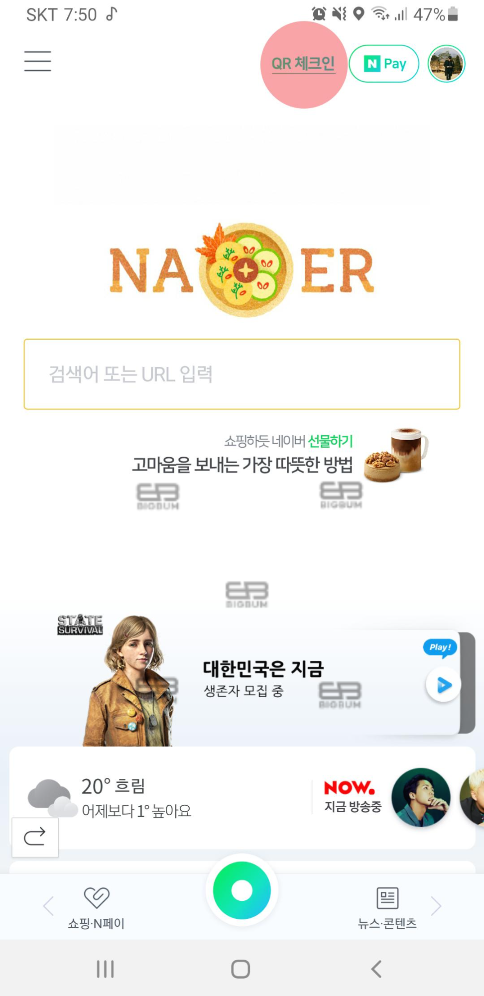 ① 먼저 네이버 앱을 실행 후 상단 QR 체크인을 클릭한다. 최신 업데이트 버전이 아닐시 좌측 상단의 三 전체 메뉴 아이콘을 클릭하면 동일한 QR 체크인 버튼을 확인할 수 있다.